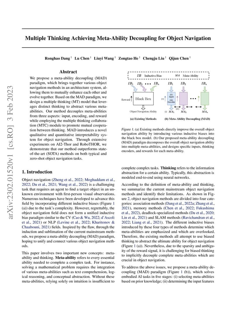 We propose a meta-ability decoupling (MAD) paradigm, which brings together various object navigation methods in an architecture system, allowing them to mutually enhance each other and evolve together. Based on the MAD paradigm, we design a multiple thinking (MT) model that leverages distinct thinking to abstract various meta-abilities. Our method decouples meta-abilities from three aspects: input, encoding, and reward while employing the multiple thinking collaboration (MTC) module to promote mutual cooperation between thinking. MAD introduces a novel qualitative and quantitative interpretability system for object navigation. Through extensive experiments on AI2-Thor and RoboTHOR, we demonstrate that our method outperforms state-of-the-art (SOTA) methods on both typical and zero-shot object navigation tasks.