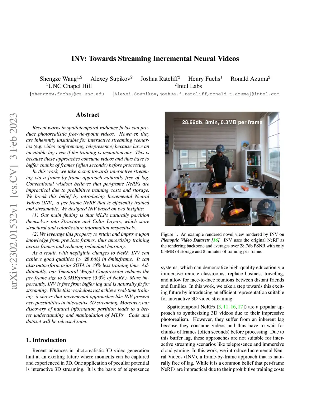 Recent works in spatiotemporal radiance fields can produce photorealistic free-viewpoint videos. However, they are inherently unsuitable for interactive streaming scenarios (e.g. video conferencing, telepresence) because have an inevitable lag even if the training is instantaneous. This is because these approaches consume videos and thus have to buffer chunks of frames (often seconds) before processing. In this work, we take a step towards interactive streaming via a frame-by-frame approach naturally free of lag. Conventional wisdom believes that per-frame NeRFs are impractical due to prohibitive training costs and storage. We break this belief by introducing Incremental Neural Videos (INV), a per-frame NeRF that is efficiently trained and streamable. We designed INV based on two insights: (1) Our main finding is that MLPs naturally partition themselves into Structure and Color Layers, which store structural and color/texture information respectively. (2) We leverage this property to retain and improve upon knowledge from previous frames, thus amortizing training across frames and reducing redundant learning. As a result, with negligible changes to NeRF, INV can achieve good qualities (>28.6db) in 8min/frame. It can also outperform prior SOTA in 19% less training time. Additionally, our Temporal Weight Compression reduces the per-frame size to 0.3MB/frame (6.6% of NeRF). More importantly, INV is free from buffer lag and is naturally fit for streaming. While this work does not achieve real-time training, it shows that incremental approaches like INV present new possibilities in interactive 3D streaming. Moreover, our discovery of natural information partition leads to a better understanding and manipulation of MLPs. Code and dataset will be released soon.