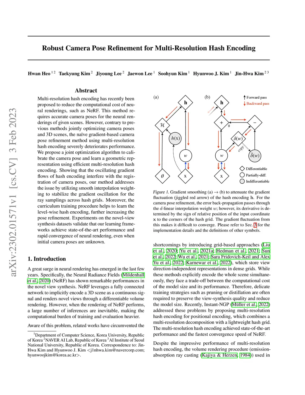 Multi-resolution hash encoding has recently been proposed to reduce the computational cost of neural renderings, such as NeRF. This method requires accurate camera poses for the neural renderings of given scenes. However, contrary to previous methods jointly optimizing camera poses and 3D scenes, the naive gradient-based camera pose refinement method using multi-resolution hash encoding severely deteriorates performance. We propose a joint optimization algorithm to calibrate the camera pose and learn a geometric representation using efficient multi-resolution hash encoding. Showing that the oscillating gradient flows of hash encoding interfere with the registration of camera poses, our method addresses the issue by utilizing smooth interpolation weighting to stabilize the gradient oscillation for the ray samplings across hash grids. Moreover, the curriculum training procedure helps to learn the level-wise hash encoding, further increasing the pose refinement. Experiments on the novel-view synthesis datasets validate that our learning frameworks achieve state-of-the-art performance and rapid convergence of neural rendering, even when initial camera poses are unknown.