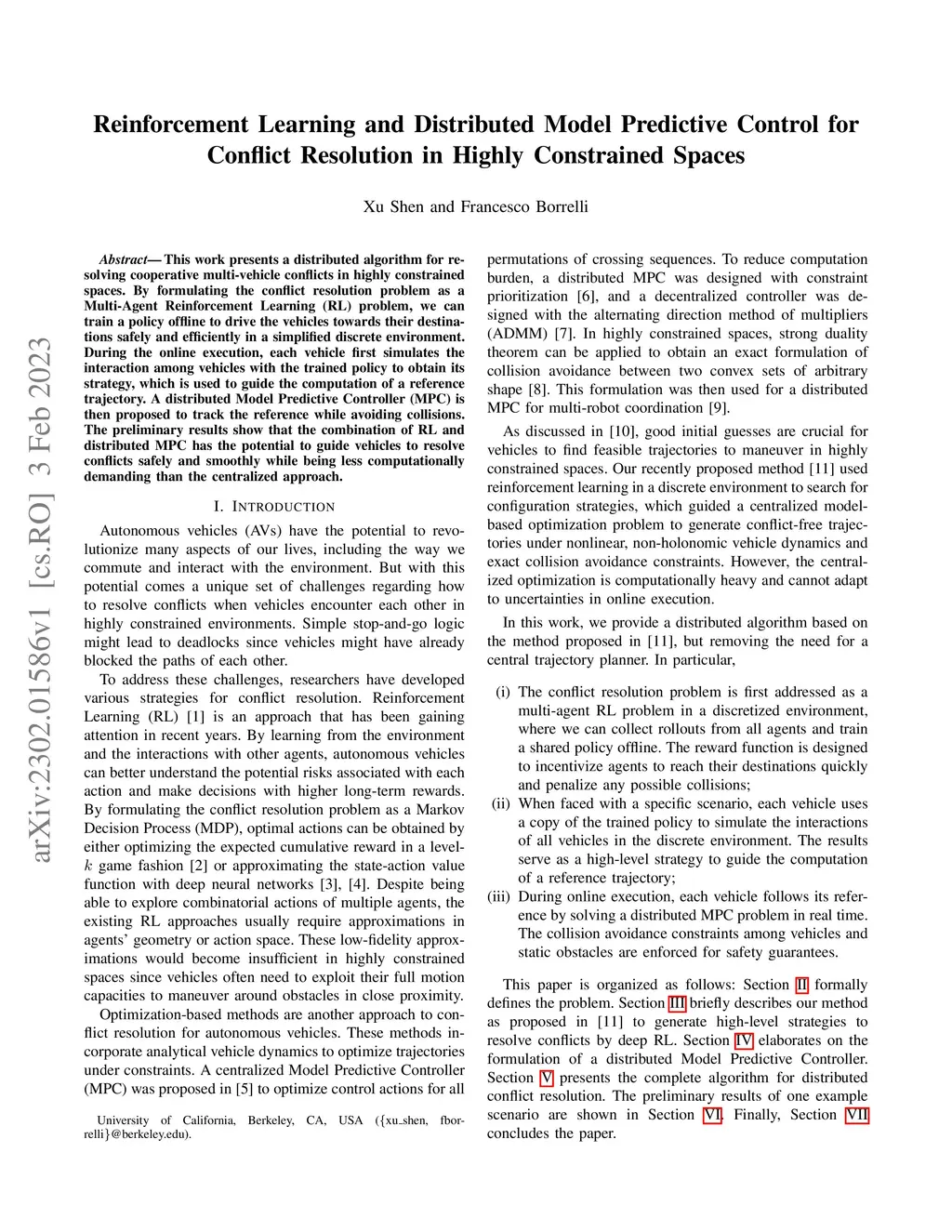 This work presents a distributed algorithm for resolving cooperative multi-vehicle conflicts in highly constrained spaces. By formulating the conflict resolution problem as a Multi-Agent Reinforcement Learning (RL) problem, we can train a policy offline to drive the vehicles towards their destinations safely and efficiently in a simplified discrete environment. During the online execution, each vehicle first simulates the interaction among vehicles with the trained policy to obtain its strategy, which is used to guide the computation of a reference trajectory. A distributed Model Predictive Controller (MPC) is then proposed to track the reference while avoiding collisions. The preliminary results show that the combination of RL and distributed MPC has the potential to guide vehicles to resolve conflicts safely and smoothly while being less computationally demanding than the centralized approach.