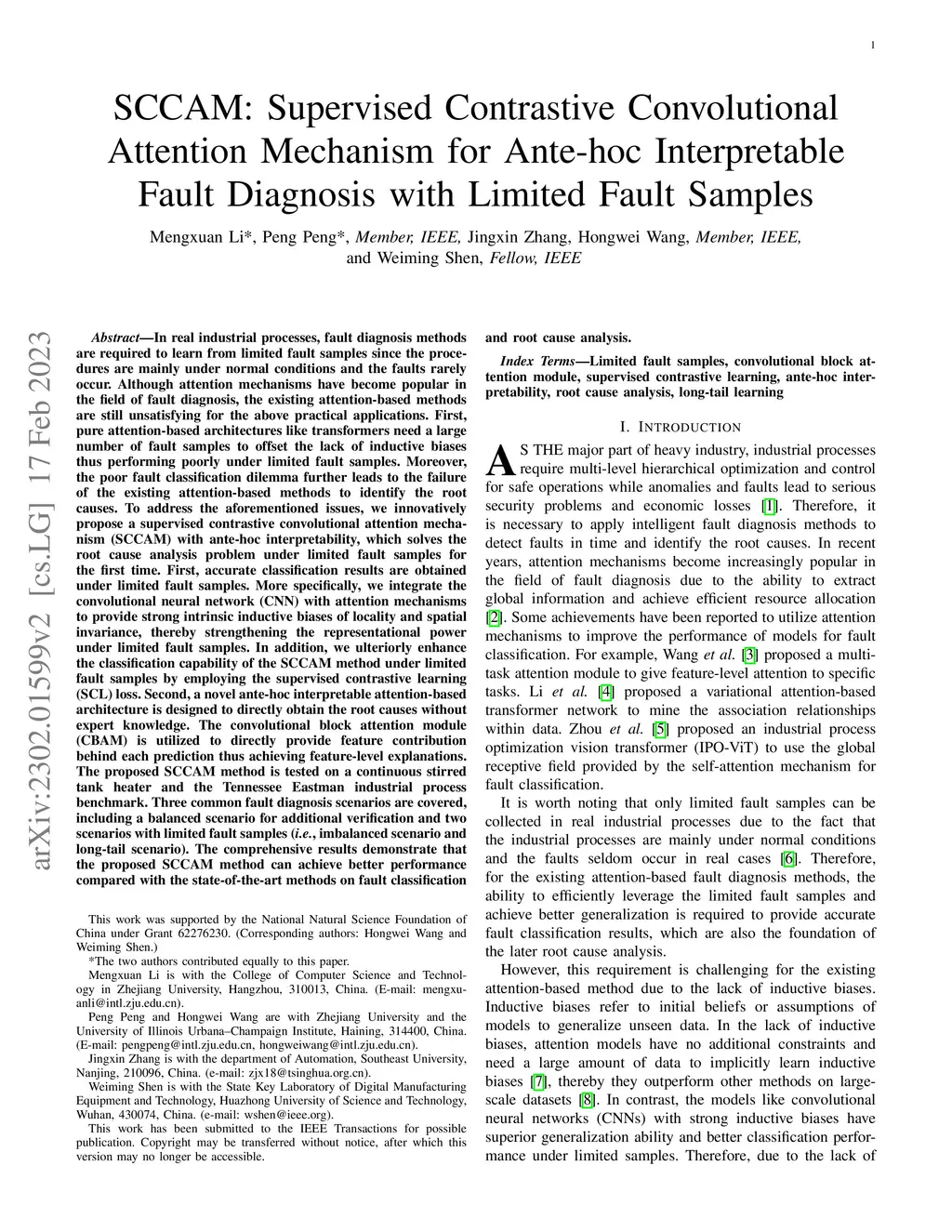 In real industrial processes, fault diagnosis methods are required to learn from limited fault samples since the procedures are mainly under normal conditions and the faults rarely occur. Although attention mechanisms have become popular in the field of fault diagnosis, the existing attention-based methods are still unsatisfying for the above practical applications. First, pure attention-based architectures like transformers need a large number of fault samples to offset the lack of inductive biases thus performing poorly under limited fault samples. Moreover, the poor fault classification dilemma further leads to the failure of the existing attention-based methods to identify the root causes. To address the aforementioned issues, we innovatively propose a supervised contrastive convolutional attention mechanism (SCCAM) with ante-hoc interpretability, which solves the root cause analysis problem under limited fault samples for the first time. The proposed SCCAM method is tested on a continuous stirred tank heater and the Tennessee Eastman industrial process benchmark. Three common fault diagnosis scenarios are covered, including a balanced scenario for additional verification and two scenarios with limited fault samples (i.e., imbalanced scenario and long-tail scenario). The comprehensive results demonstrate that the proposed SCCAM method can achieve better performance compared with the state-of-the-art methods on fault classification and root cause analysis.