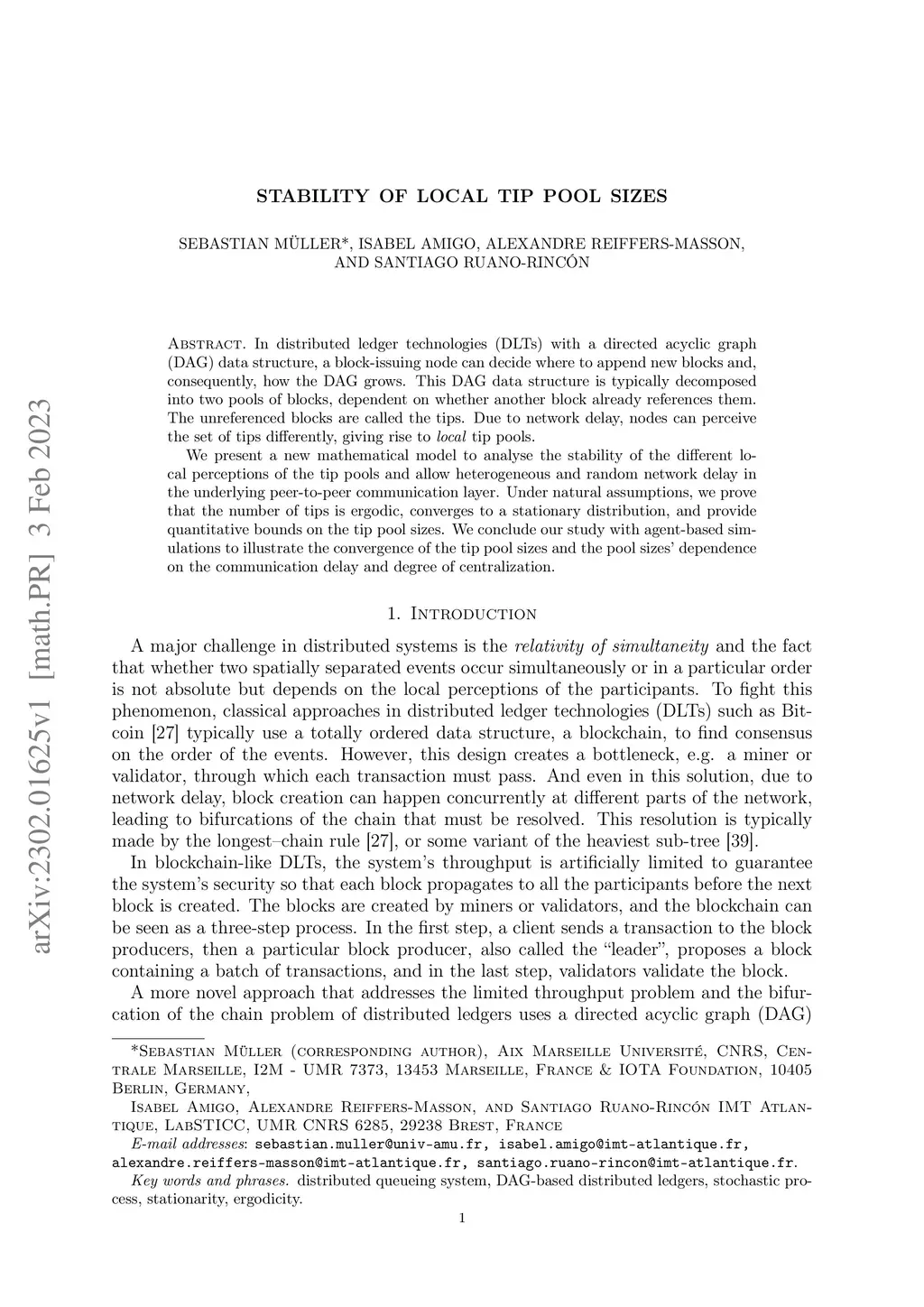 In distributed ledger technologies (DLTs) with a directed acyclic graph (DAG) data structure, a block-issuing node can decide where to append new blocks and, consequently, how the DAG grows. This DAG data structure is typically decomposed into two pools of blocks, dependent on whether another block already references them. The unreferenced blocks are called the tips. Due to network delay, nodes can perceive the set of tips differently, giving rise to local tip pools. We present a new mathematical model to analyse the stability of the different local perceptions of the tip pools and allow heterogeneous and random network delay in the underlying peer-to-peer communication layer. Under natural assumptions, we prove that the number of tips is ergodic, converges to a stationary distribution, and provide quantitative bounds on the tip pool sizes. We conclude our study with agent-based simulations to illustrate the convergence of the tip pool sizes and the pool sizes' dependence on the communication delay and degree of centralization.