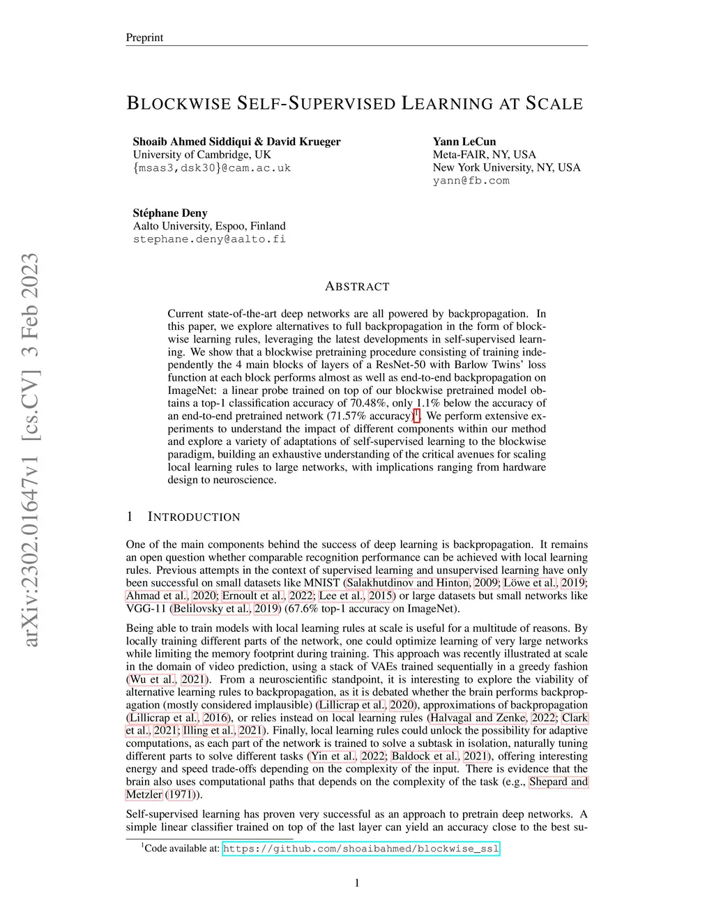 Current state-of-the-art deep networks are all powered by backpropagation. In this paper, we explore alternatives to full backpropagation in the form of blockwise learning rules, leveraging the latest developments in self-supervised learning. We show that a blockwise pretraining procedure consisting of training independently the 4 main blocks of layers of a ResNet-50 with Barlow Twins' loss function at each block performs almost as well as end-to-end backpropagation on ImageNet: a linear probe trained on top of our blockwise pretrained model obtains a top-1 classification accuracy of 70.48%, only 1.1% below the accuracy of an end-to-end pretrained network (71.57% accuracy). We perform extensive experiments to understand the impact of different components within our method and explore a variety of adaptations of self-supervised learning to the blockwise paradigm, building an exhaustive understanding of the critical avenues for scaling local learning rules to large networks, with implications ranging from hardware design to neuroscience.