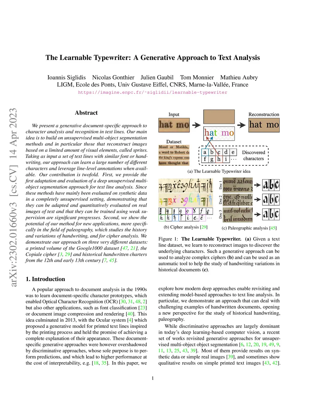 We present a generative document-specific approach to character analysis and recognition in text lines. Our main idea is to build on unsupervised multi-object segmentation methods and in particular those that reconstruct images based on a limited amount of visual elements, called sprites. Taking as input a set of text lines with similar font or handwriting, our approach can learn a large number of different characters and leverage line-level annotations when available. Our contribution is twofold. First, we provide the first adaptation and evaluation of a deep unsupervised multi-object segmentation approach for text line analysis. Since these methods have mainly been evaluated on synthetic data in a completely unsupervised setting, demonstrating that they can be adapted and quantitatively evaluated on real images of text and that they can be trained using weak supervision are significant progresses. Second, we show the potential of our method for new applications, more specifically in the field of paleography, which studies the history and variations of handwriting, and for cipher analysis. We demonstrate our approach on three very different datasets: a printed volume of the Google1000 dataset, the Copiale cipher and historical handwritten charters from the 12th and early 13th century.