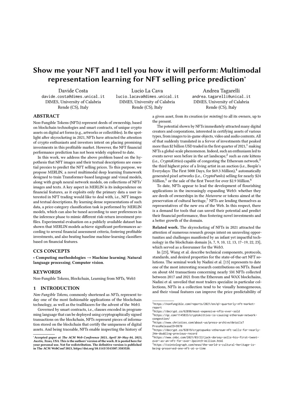 Non-Fungible Tokens (NFTs) represent deeds of ownership, based on blockchain technologies and smart contracts, of unique crypto assets on digital art forms (e.g., artworks or collectibles). In the spotlight after skyrocketing in 2021, NFTs have attracted the attention of crypto enthusiasts and investors intent on placing promising investments in this profitable market. However, the NFT financial performance prediction has not been widely explored to date. In this work, we address the above problem based on the hypothesis that NFT images and their textual descriptions are essential proxies to predict the NFT selling prices. To this purpose, we propose MERLIN, a novel multimodal deep learning framework designed to train Transformer-based language and visual models, along with graph neural network models, on collections of NFTs' images and texts. A key aspect in MERLIN is its independence on financial features, as it exploits only the primary data a user interested in NFT trading would like to deal with, i.e., NFT images and textual descriptions. By learning dense representations of such data, a price-category classification task is performed by MERLIN models, which can also be tuned according to user preferences in the inference phase to mimic different risk-return investment profiles. Experimental evaluation on a publicly available dataset has shown that MERLIN models achieve significant performances according to several financial assessment criteria, fostering profitable investments, and also beating baseline machine-learning classifiers based on financial features.