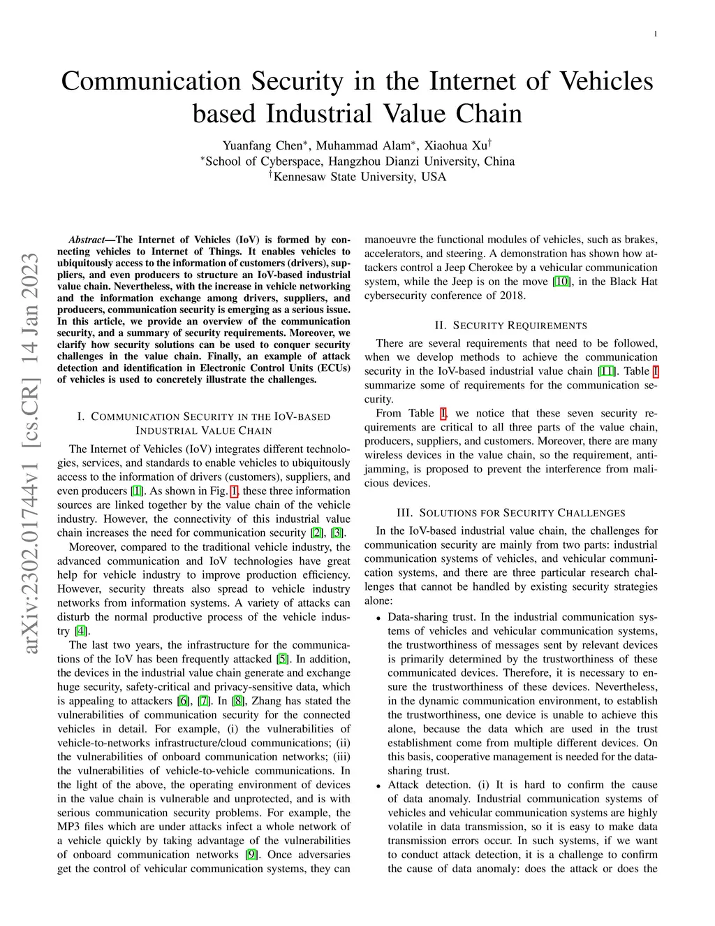 The Internet of Vehicles (IoV) is formed by connecting vehicles to Internet of Things. It enables vehicles to ubiquitously access to the information of customers (drivers), suppliers, and even producers to structure an IoV-based industrial value chain. Nevertheless, with the increase in vehicle networking and the information exchange among drivers, suppliers, and producers, communication security is emerging as a serious issue. In this article, we provide an overview of the communication security, and a summary of security requirements. Moreover, we clarify how security solutions can be used to conquer security challenges in the value chain. Finally, an example of attack detection and identification in Electronic Control Units (ECUs) of vehicles is used to concretely illustrate the challenges.