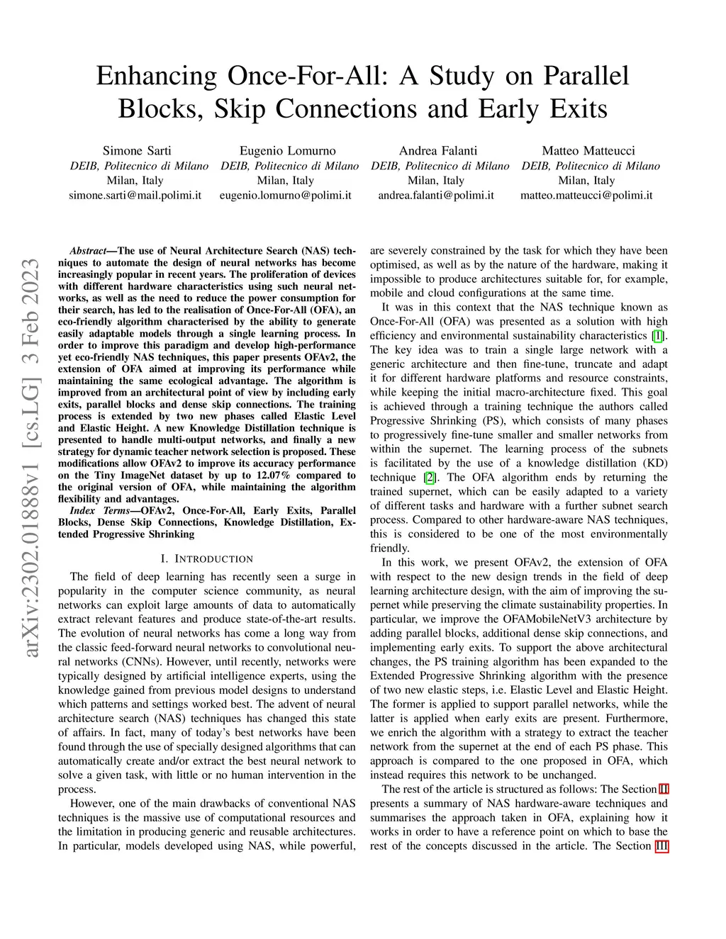 The use of Neural Architecture Search (NAS) techniques to automate the design of neural networks has become increasingly popular in recent years. The proliferation of devices with different hardware characteristics using such neural networks, as well as the need to reduce the power consumption for their search, has led to the realisation of Once-For-All (OFA), an eco-friendly algorithm characterised by the ability to generate easily adaptable models through a single learning process. In order to improve this paradigm and develop high-performance yet eco-friendly NAS techniques, this paper presents OFAv2, the extension of OFA aimed at improving its performance while maintaining the same ecological advantage. The algorithm is improved from an architectural point of view by including early exits, parallel blocks and dense skip connections. The training process is extended by two new phases called Elastic Level and Elastic Height. A new Knowledge Distillation technique is presented to handle multi-output networks, and finally a new strategy for dynamic teacher network selection is proposed. These modifications allow OFAv2 to improve its accuracy performance on the Tiny ImageNet dataset by up to 12.07% compared to the original version of OFA, while maintaining the algorithm flexibility and advantages.