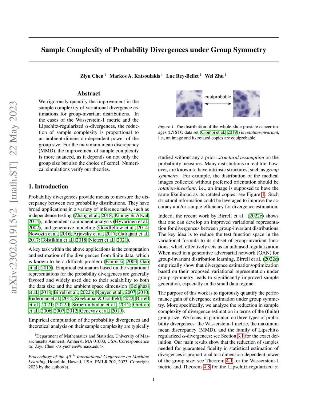 We rigorously quantify the improvement in the sample complexity of variational divergence estimations for group-invariant distributions. In the cases of the Wasserstein-1 metric and the Lipschitz-regularized -divergences, the reduction of sample complexity is proportional to an ambient-dimension-dependent power of the group size. For the maximum mean discrepancy (MMD), the improvement of sample complexity is more nuanced, as it depends on not only the group size but also the choice of kernel. Numerical simulations verify our theories.