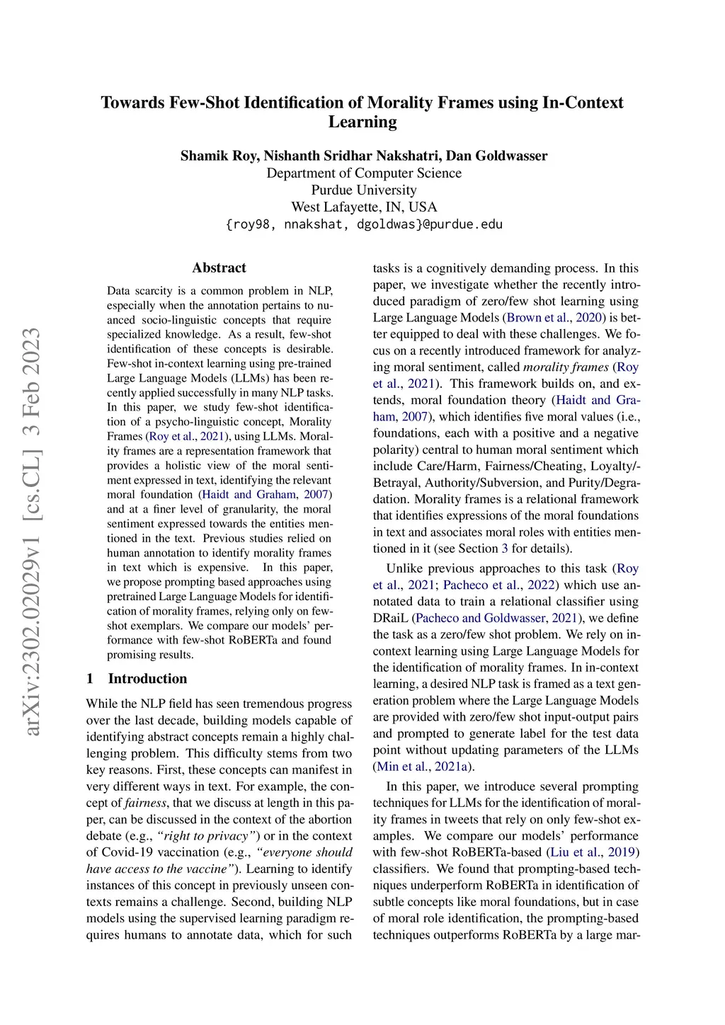 Data scarcity is a common problem in NLP, especially when the annotation pertains to nuanced socio-linguistic concepts that require specialized knowledge. As a result, few-shot identification of these concepts is desirable. Few-shot in-context learning using pre-trained Large Language Models (LLMs) has been recently applied successfully in many NLP tasks. In this paper, we study few-shot identification of a psycho-linguistic concept, Morality Frames (Roy et al., 2021), using LLMs. Morality frames are a representation framework that provides a holistic view of the moral sentiment expressed in text, identifying the relevant moral foundation (Haidt and Graham, 2007) and at a finer level of granularity, the moral sentiment expressed towards the entities mentioned in the text. Previous studies relied on human annotation to identify morality frames in text which is expensive. In this paper, we propose prompting-based approaches using pretrained Large Language Models for identification of morality frames, relying only on few-shot exemplars. We compare our models' performance with few-shot RoBERTa and found promising results.