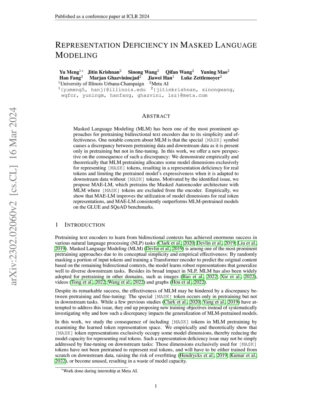 Masked Language Modeling (MLM) has been one of the most prominent approaches for pretraining bidirectional text encoders due to its simplicity and effectiveness. One notable concern about MLM is that the special symbol causes a discrepancy between pretraining data and downstream data as it is present only in pretraining but not in fine-tuning. In this work, we offer a new perspective on the consequence of such a discrepancy: We demonstrate empirically and theoretically that MLM pretraining allocates some model dimensions exclusively for representing tokens, resulting in a representation deficiency for real tokens and limiting the pretrained model's expressiveness when it is adapted to downstream data without tokens. Motivated by the identified issue, we propose MAE-LM, which pretrains the Masked Autoencoder architecture with MLM where tokens are excluded from the encoder. Empirically, we show that MAE-LM improves the utilization of model dimensions for real token representations, and MAE-LM consistently outperforms MLM-pretrained models across different pretraining settings and model sizes when fine-tuned on the GLUE and SQuAD benchmarks.