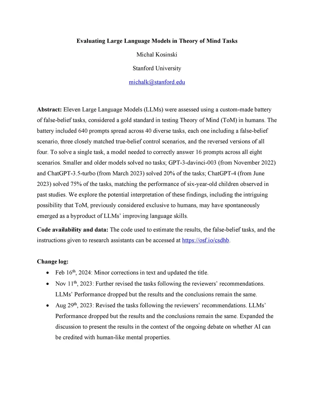 We explore the intriguing possibility that theory of mind (ToM), or the uniquely human ability to impute unobservable mental states to others, might have spontaneously emerged in large language models (LLMs). We designed 40 false-belief tasks, considered a gold standard in testing ToM in humans, and administered them to several LLMs. Each task included a false-belief scenario, three closely matched true-belief controls, and the reversed versions of all four. Smaller and older models solved no tasks; GPT-3-davinci-001 (from May 2020) and GPT-3-davinci-002 (from January 2022) solved 10%; and GPT-3-davinci-003 (from November 2022) and ChatGPT-3.5-turbo (from March 2023) solved 35% of the tasks, mirroring the performance of three-year-old children. ChatGPT-4 (from June 2023) solved 90% of the tasks, matching the performance of seven-year-old children. These findings suggest the intriguing possibility that ToM, previously considered exclusive to humans, may have spontaneously emerged as a byproduct of LLMs' improving language skills.