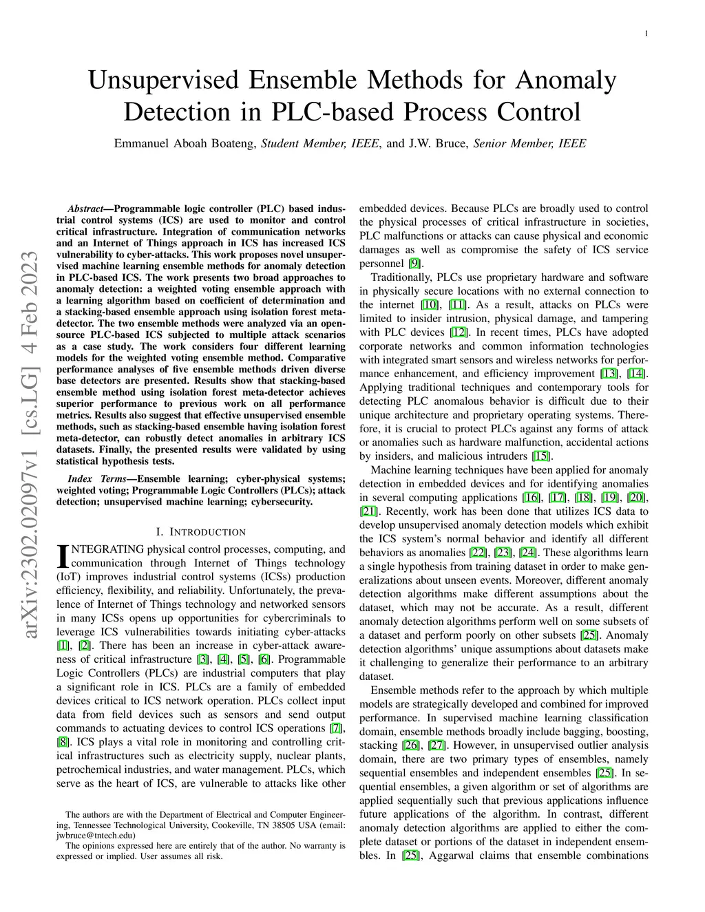 Programmable logic controller (PLC) based industrial control systems (ICS) are used to monitor and control critical infrastructure. Integration of communication networks and an Internet of Things approach in ICS has increased ICS vulnerability to cyber-attacks. This work proposes novel unsupervised machine learning ensemble methods for anomaly detection in PLC-based ICS. The work presents two broad approaches to anomaly detection: a weighted voting ensemble approach with a learning algorithm based on coefficient of determination and a stacking-based ensemble approach using isolation forest meta-detector. The two ensemble methods were analyzed via an open-source PLC-based ICS subjected to multiple attack scenarios as a case study. The work considers four different learning models for the weighted voting ensemble method. Comparative performance analyses of five ensemble methods driven diverse base detectors are presented. Results show that stacking-based ensemble method using isolation forest meta-detector achieves superior performance to previous work on all performance metrics. Results also suggest that effective unsupervised ensemble methods, such as stacking-based ensemble having isolation forest meta-detector, can robustly detect anomalies in arbitrary ICS datasets. Finally, the presented results were validated by using statistical hypothesis tests.