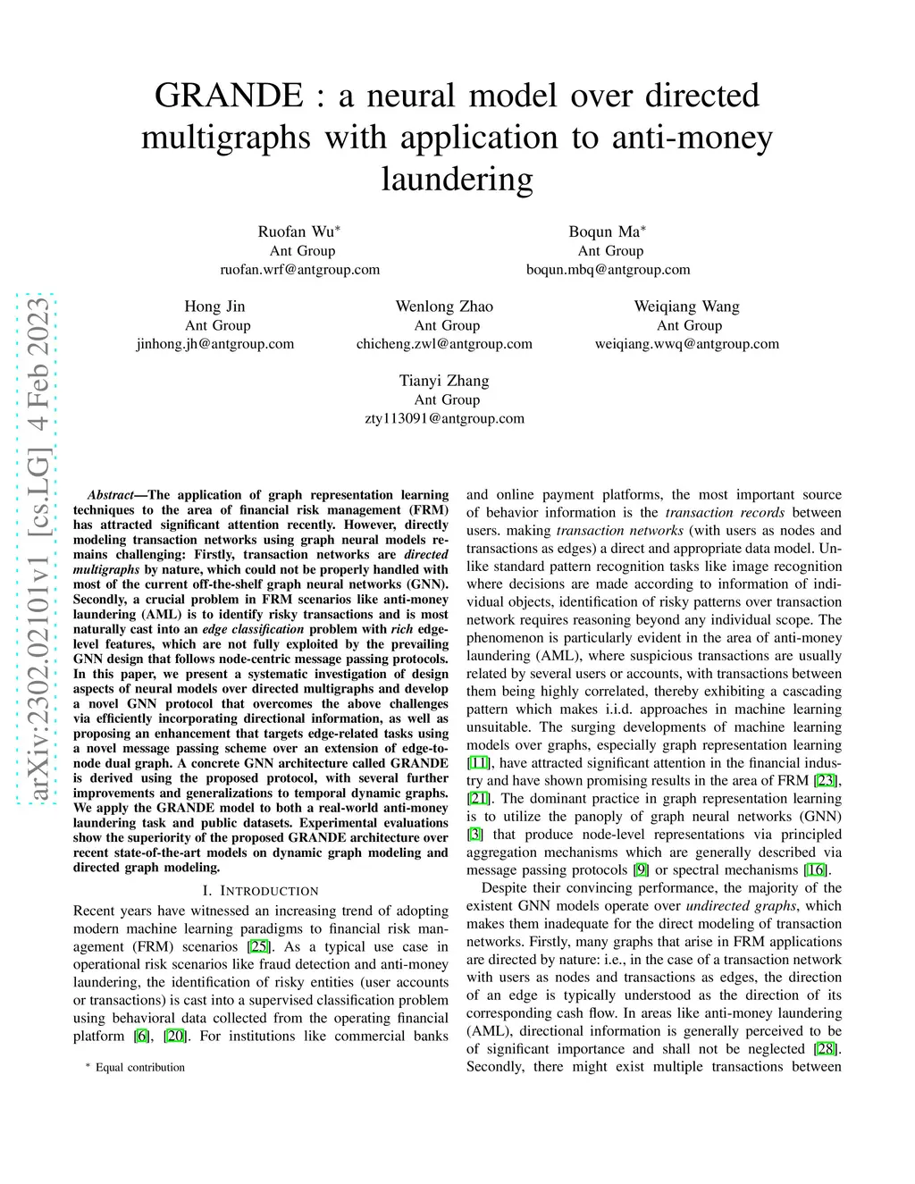 The application of graph representation learning techniques to the area of financial risk management (FRM) has attracted significant attention recently. However, directly modeling transaction networks using graph neural models remains challenging: Firstly, transaction networks are directed multigraphs by nature, which could not be properly handled with most of the current off-the-shelf graph neural networks (GNN). Secondly, a crucial problem in FRM scenarios like anti-money laundering (AML) is to identify risky transactions and is most naturally cast into an edge classification problem with rich edge-level features, which are not fully exploited by the prevailing GNN design that follows node-centric message passing protocols. In this paper, we present a systematic investigation of design aspects of neural models over directed multigraphs and develop a novel GNN protocol that overcomes the above challenges via efficiently incorporating directional information, as well as proposing an enhancement that targets edge-related tasks using a novel message passing scheme over an extension of edge-to-node dual graph. A concrete GNN architecture called GRANDE is derived using the proposed protocol, with several further improvements and generalizations to temporal dynamic graphs. We apply the GRANDE model to both a real-world anti-money laundering task and public datasets. Experimental evaluations show the superiority of the proposed GRANDE architecture over recent state-of-the-art models on dynamic graph modeling and directed graph modeling.