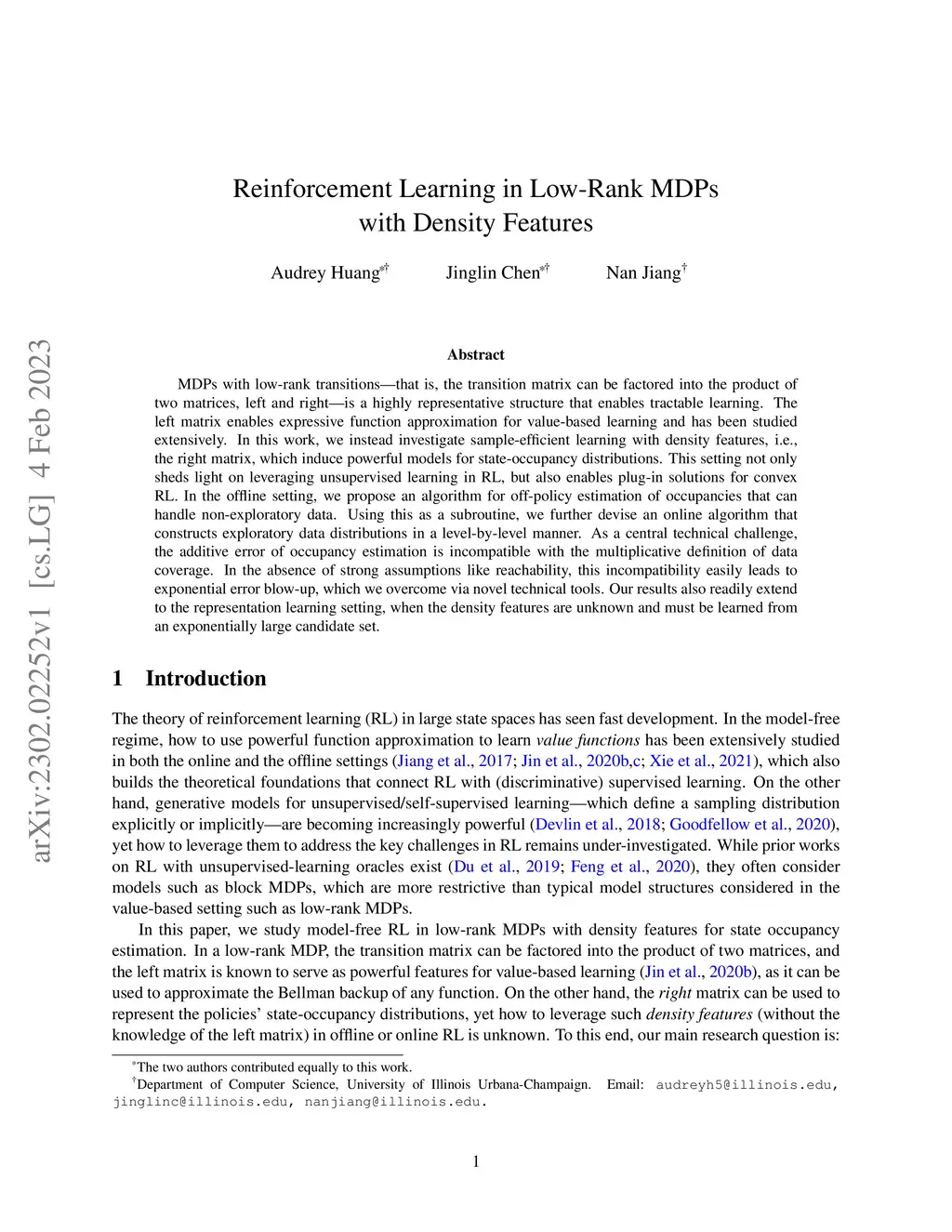 MDPs with low-rank transitions -- that is, the transition matrix can be factored into the product of two matrices, left and right -- is a highly representative structure that enables tractable learning. The left matrix enables expressive function approximation for value-based learning and has been studied extensively. In this work, we instead investigate sample-efficient learning with density features, i.e., the right matrix, which induce powerful models for state-occupancy distributions. This setting not only sheds light on leveraging unsupervised learning in RL, but also enables plug-in solutions for convex RL. In the offline setting, we propose an algorithm for off-policy estimation of occupancies that can handle non-exploratory data. Using this as a subroutine, we further devise an online algorithm that constructs exploratory data distributions in a level-by-level manner. As a central technical challenge, the additive error of occupancy estimation is incompatible with the multiplicative definition of data coverage. In the absence of strong assumptions like reachability, this incompatibility easily leads to exponential error blow-up, which we overcome via novel technical tools. Our results also readily extend to the representation learning setting, when the density features are unknown and must be learned from an exponentially large candidate set.