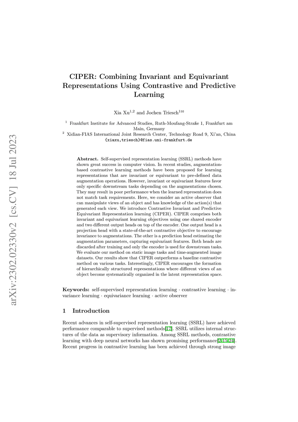 Self-supervised representation learning (SSRL) methods have shown great success in computer vision. In recent studies, augmentation-based contrastive learning methods have been proposed for learning representations that are invariant or equivariant to pre-defined data augmentation operations. However, invariant or equivariant features favor only specific downstream tasks depending on the augmentations chosen. They may result in poor performance when the learned representation does not match task requirements. Here, we consider an active observer that can manipulate views of an object and has knowledge of the action(s) that generated each view. We introduce Contrastive Invariant and Predictive Equivariant Representation learning (CIPER). CIPER comprises both invariant and equivariant learning objectives using one shared encoder and two different output heads on top of the encoder. One output head is a projection head with a state-of-the-art contrastive objective to encourage invariance to augmentations. The other is a prediction head estimating the augmentation parameters, capturing equivariant features. Both heads are discarded after training and only the encoder is used for downstream tasks. We evaluate our method on static image tasks and time-augmented image datasets. Our results show that CIPER outperforms a baseline contrastive method on various tasks. Interestingly, CIPER encourages the formation of hierarchically structured representations where different views of an object become systematically organized in the latent representation space.