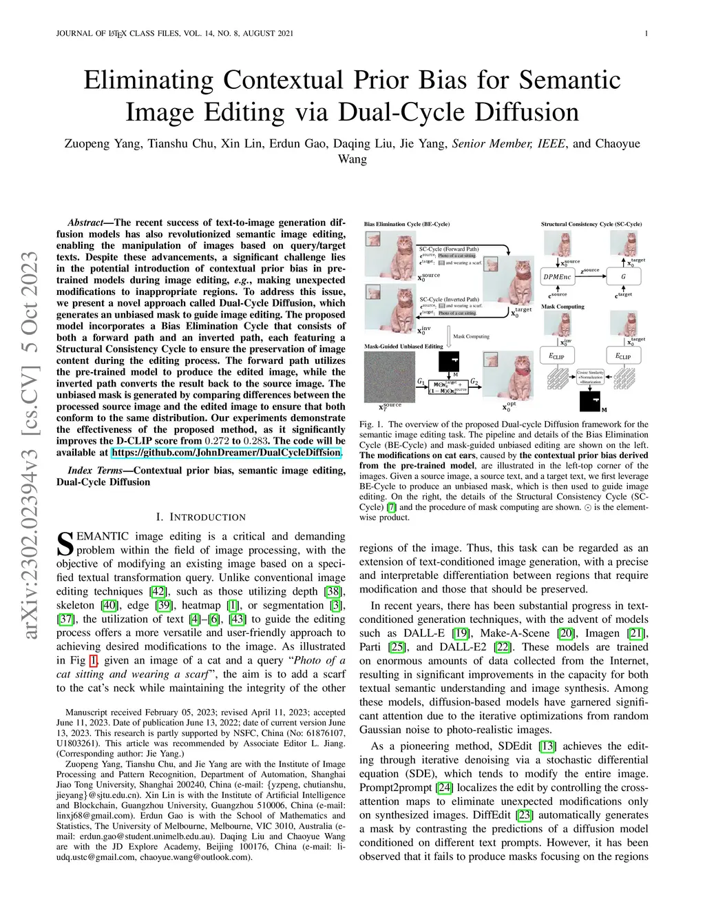 The recent success of text-to-image generation diffusion models has also revolutionized semantic image editing, enabling the manipulation of images based on query/target texts. Despite these advancements, a significant challenge lies in the potential introduction of contextual prior bias in pre-trained models during image editing, e.g., making unexpected modifications to inappropriate regions. To address this issue, we present a novel approach called Dual-Cycle Diffusion, which generates an unbiased mask to guide image editing. The proposed model incorporates a Bias Elimination Cycle that consists of both a forward path and an inverted path, each featuring a Structural Consistency Cycle to ensure the preservation of image content during the editing process. The forward path utilizes the pre-trained model to produce the edited image, while the inverted path converts the result back to the source image. The unbiased mask is generated by comparing differences between the processed source image and the edited image to ensure that both conform to the same distribution. Our experiments demonstrate the effectiveness of the proposed method, as it significantly improves the D-CLIP score from 0.272 to 0.283. The code will be available at https://github.com/JohnDreamer/DualCycleDiffsion.