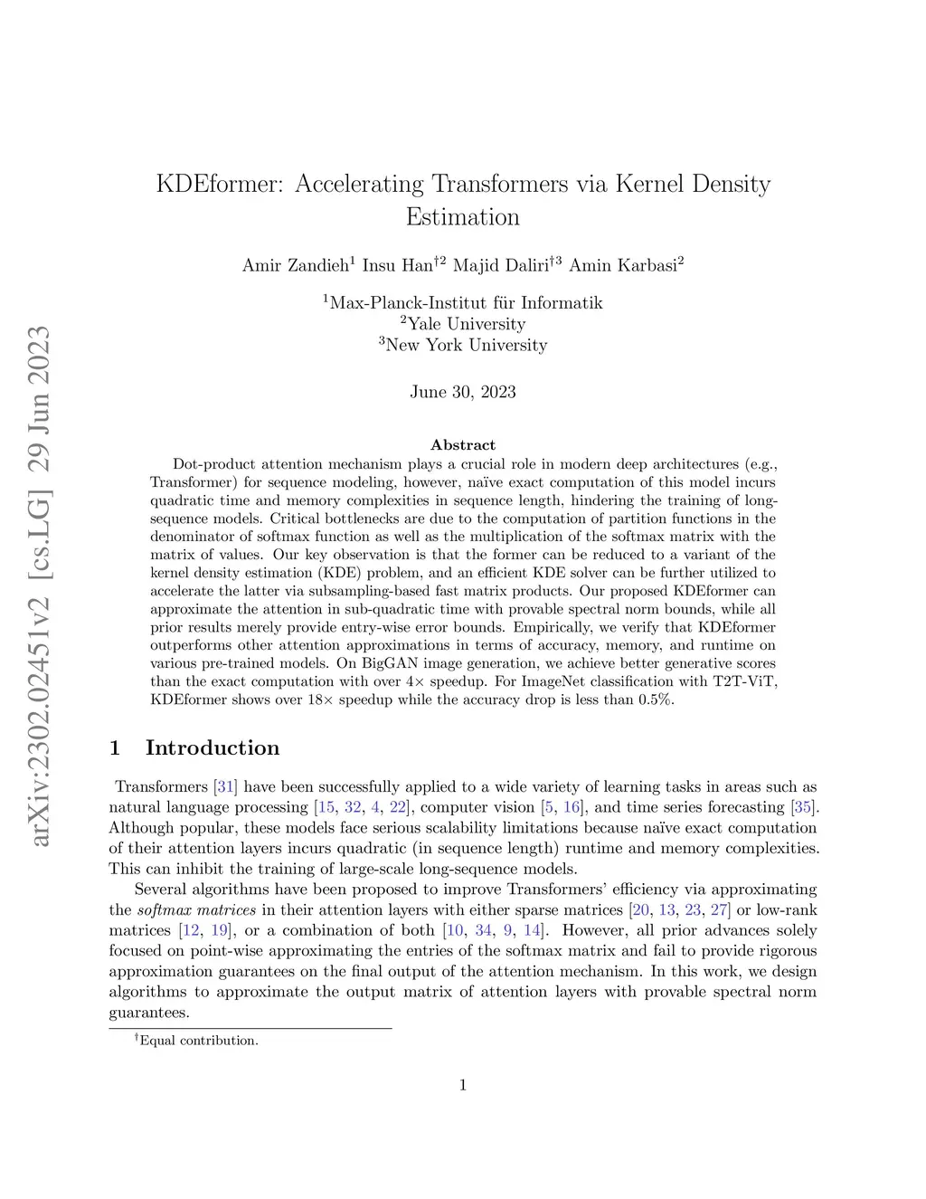 Dot-product attention mechanism plays a crucial role in modern deep architectures (e.g., Transformer) for sequence modeling, however, na\"ive exact computation of this model incurs quadratic time and memory complexities in sequence length, hindering the training of long-sequence models. Critical bottlenecks are due to the computation of partition functions in the denominator of softmax function as well as the multiplication of the softmax matrix with the matrix of values. Our key observation is that the former can be reduced to a variant of the kernel density estimation (KDE) problem, and an efficient KDE solver can be further utilized to accelerate the latter via subsampling-based fast matrix products. Our proposed KDEformer can approximate the attention in sub-quadratic time with provable spectral norm bounds, while all prior results merely provide entry-wise error bounds. Empirically, we verify that KDEformer outperforms other attention approximations in terms of accuracy, memory, and runtime on various pre-trained models. On BigGAN image generation, we achieve better generative scores than the exact computation with over speedup. For ImageNet classification with T2T-ViT, KDEformer shows over speedup while the accuracy drop is less than .