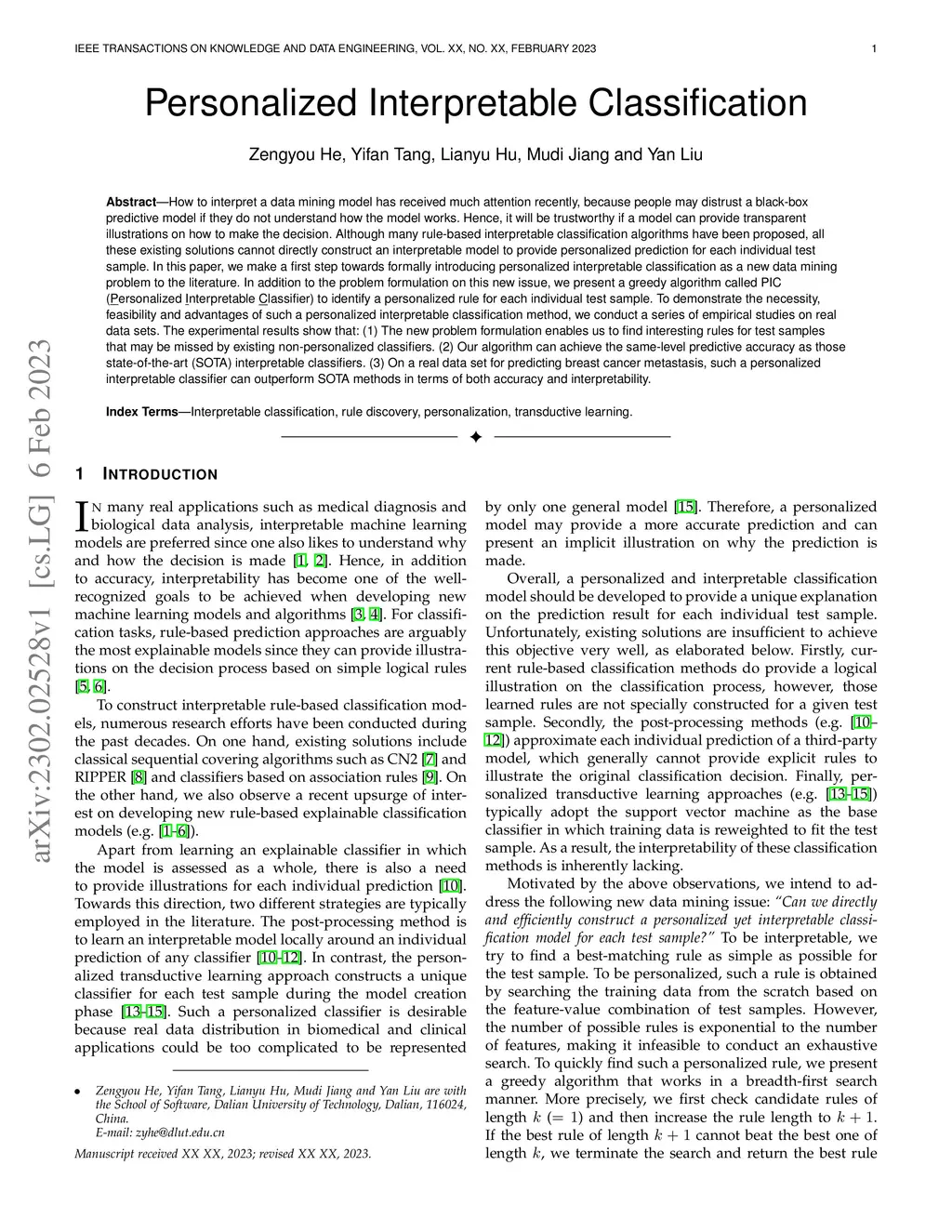 How to interpret a data mining model has received much attention recently, because people may distrust a black-box predictive model if they do not understand how the model works. Hence, it will be trustworthy if a model can provide transparent illustrations on how to make the decision. Although many rule-based interpretable classification algorithms have been proposed, all these existing solutions cannot directly construct an interpretable model to provide personalized prediction for each individual test sample. In this paper, we make a first step towards formally introducing personalized interpretable classification as a new data mining problem to the literature. In addition to the problem formulation on this new issue, we present a greedy algorithm called PIC (Personalized Interpretable Classifier) to identify a personalized rule for each individual test sample. To demonstrate the necessity, feasibility and advantages of such a personalized interpretable classification method, we conduct a series of empirical studies on real data sets. The experimental results show that: (1) The new problem formulation enables us to find interesting rules for test samples that may be missed by existing non-personalized classifiers. (2) Our algorithm can achieve the same-level predictive accuracy as those state-of-the-art (SOTA) interpretable classifiers. (3) On a real data set for predicting breast cancer metastasis, such a personalized interpretable classifier can outperform SOTA methods in terms of both accuracy and interpretability.