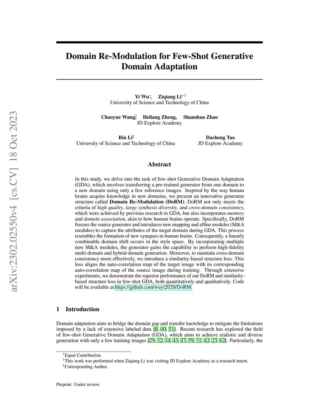 In this study, we delve into the task of few-shot Generative Domain Adaptation (GDA), which involves transferring a pre-trained generator from one domain to a new domain using only a few reference images. Inspired by the way human brains acquire knowledge in new domains, we present an innovative generator structure called Domain Re-Modulation (DoRM). DoRM not only meets the criteria of high quality, large synthesis diversity, and cross-domain consistency, which were achieved by previous research in GDA, but also incorporates memory and domain association, akin to how human brains operate. Specifically, DoRM freezes the source generator and introduces new mapping and affine modules (M&A modules) to capture the attributes of the target domain during GDA. This process resembles the formation of new synapses in human brains. Consequently, a linearly combinable domain shift occurs in the style space. By incorporating multiple new M&A modules, the generator gains the capability to perform high-fidelity multi-domain and hybrid-domain generation. Moreover, to maintain cross-domain consistency more effectively, we introduce a similarity-based structure loss. This loss aligns the auto-correlation map of the target image with its corresponding auto-correlation map of the source image during training. Through extensive experiments, we demonstrate the superior performance of our DoRM and similarity-based structure loss in few-shot GDA, both quantitatively and qualitatively. The code will be available at https://github.com/wuyi2020/DoRM.