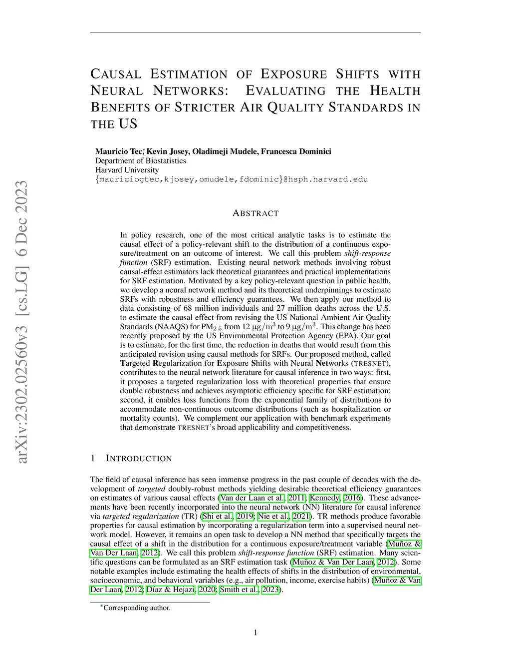 In policy research, one of the most critical analytic tasks is to estimate the causal effect of a policy-relevant shift to the distribution of a continuous exposure/treatment on an outcome of interest. We call this problem shift-response function (SRF) estimation. Existing neural network methods involving robust causal-effect estimators lack theoretical guarantees and practical implementations for SRF estimation. Motivated by a key policy-relevant question in public health, we develop a neural network method and its theoretical underpinnings to estimate SRFs with robustness and efficiency guarantees. We then apply our method to data consisting of 68 million individuals and 27 million deaths across the U.S. to estimate the causal effect from revising the US National Ambient Air Quality Standards (NAAQS) for PM 2.5 from 12 to 9 . This change has been recently proposed by the US Environmental Protection Agency (EPA). Our goal is to estimate, for the first time, the reduction in deaths that would result from this anticipated revision using causal methods for SRFs. Our proposed method, called {T}argeted {R}egularization for {E}xposure {S}hifts with Neural {Net}works (TRESNET), contributes to the neural network literature for causal inference in two ways: first, it proposes a targeted regularization loss with theoretical properties that ensure double robustness and achieves asymptotic efficiency specific for SRF estimation; second, it enables loss functions from the exponential family of distributions to accommodate non-continuous outcome distributions (such as hospitalization or mortality counts). We complement our application with benchmark experiments that demonstrate TRESNET's broad applicability and competitiveness.