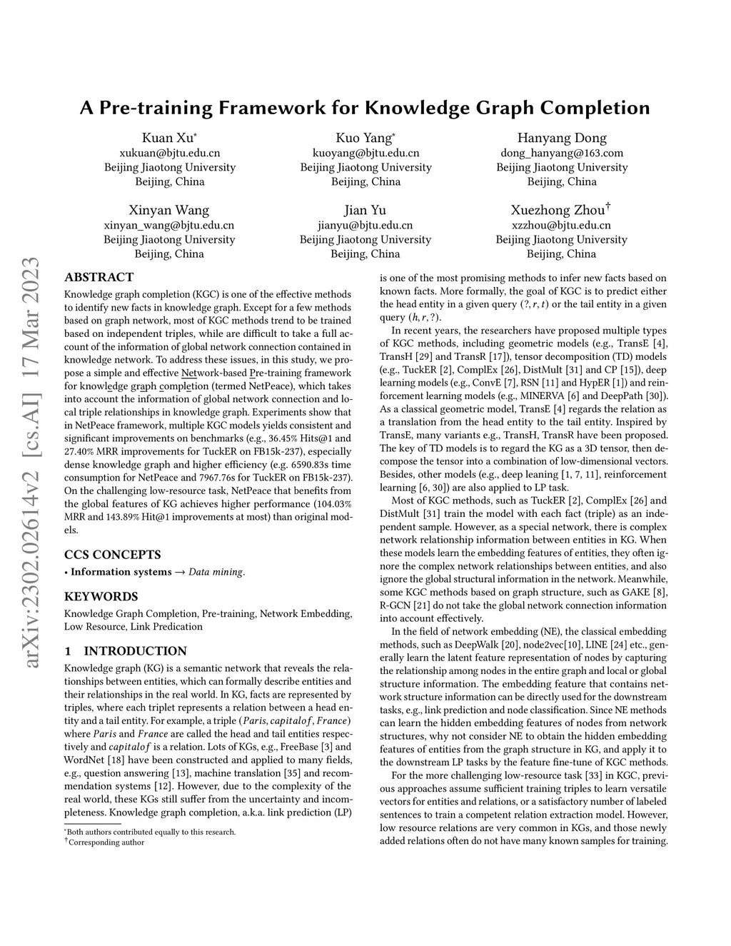 Knowledge graph completion (KGC) is one of the effective methods to identify new facts in knowledge graph. Except for a few methods based on graph network, most of KGC methods trend to be trained based on independent triples, while are difficult to take a full account of the information of global network connection contained in knowledge network. To address these issues, in this study, we propose a simple and effective Network-based Pre-training framework for knowledge graph completion (termed NetPeace), which takes into account the information of global network connection and local triple relationships in knowledge graph. Experiments show that in NetPeace framework, multiple KGC models yields consistent and significant improvements on benchmarks (e.g., 36.45% Hits@1 and 27.40% MRR improvements for TuckER on FB15k-237), especially dense knowledge graph. On the challenging low-resource task, NetPeace that benefits from the global features of KG achieves higher performance (104.03% MRR and 143.89% Hit@1 improvements at most) than original models.