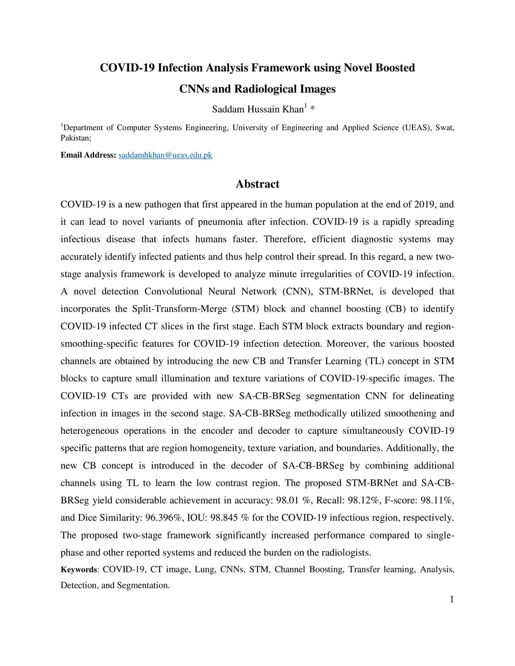 COVID-19 is a new pathogen that first appeared in the human population at the end of 2019, and it can lead to novel variants of pneumonia after infection. COVID-19 is a rapidly spreading infectious disease that infects humans faster. Therefore, efficient diagnostic systems may accurately identify infected patients and thus help control their spread. In this regard, a new two-stage analysis framework is developed to analyze minute irregularities of COVID-19 infection. A novel detection Convolutional Neural Network (CNN), STM-BRNet, is developed that incorporates the Split-Transform-Merge (STM) block and channel boosting (CB) to identify COVID-19 infected CT slices in the first stage. Each STM block extracts boundary and region-smoothing-specific features for COVID-19 infection detection. Moreover, the various boosted channels are obtained by introducing the new CB and Transfer Learning (TL) concept in STM blocks to capture small illumination and texture variations of COVID-19-specific images. The COVID-19 CTs are provided with new SA-CB-BRSeg segmentation CNN for delineating infection in images in the second stage. SA-CB-BRSeg methodically utilized smoothening and heterogeneous operations in the encoder and decoder to capture simultaneously COVID-19 specific patterns that are region homogeneity, texture variation, and boundaries. Additionally, the new CB concept is introduced in the decoder of SA-CB-BRSeg by combining additional channels using TL to learn the low contrast region. The proposed STM-BRNet and SA-CB-BRSeg yield considerable achievement in accuracy: 98.01 %, Recall: 98.12%, F-score: 98.11%, and Dice Similarity: 96.396%, IOU: 98.845 % for the COVID-19 infectious region, respectively. The proposed two-stage framework significantly increased performance compared to single-phase and other reported systems and reduced the burden on the radiologists.