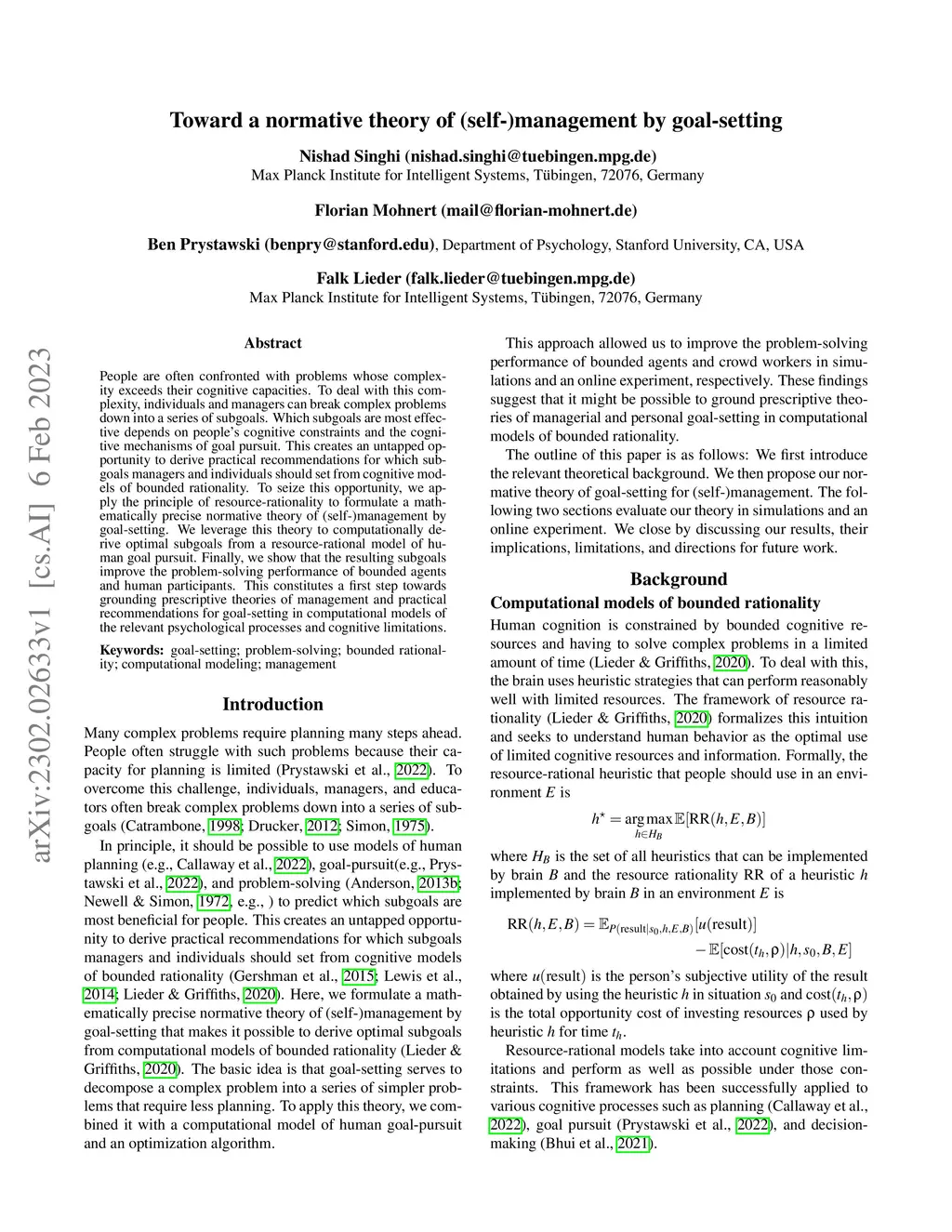 People are often confronted with problems whose complexity exceeds their cognitive capacities. To deal with this complexity, individuals and managers can break complex problems down into a series of subgoals. Which subgoals are most effective depends on people's cognitive constraints and the cognitive mechanisms of goal pursuit. This creates an untapped opportunity to derive practical recommendations for which subgoals managers and individuals should set from cognitive models of bounded rationality. To seize this opportunity, we apply the principle of resource-rationality to formulate a mathematically precise normative theory of (self-)management by goal-setting. We leverage this theory to computationally derive optimal subgoals from a resource-rational model of human goal pursuit. Finally, we show that the resulting subgoals improve the problem-solving performance of bounded agents and human participants. This constitutes a first step towards grounding prescriptive theories of management and practical recommendations for goal-setting in computational models of the relevant psychological processes and cognitive limitations.