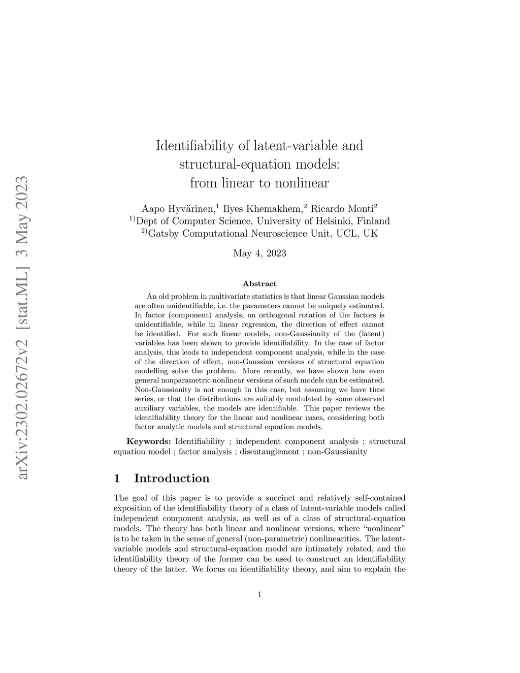 An old problem in multivariate statistics is that linear Gaussian models are often unidentifiable, i.e. some parameters cannot be uniquely estimated. In factor (component) analysis, an orthogonal rotation of the factors is unidentifiable, while in linear regression, the direction of effect cannot be identified. For such linear models, non-Gaussianity of the (latent) variables has been shown to provide identifiability. In the case of factor analysis, this leads to independent component analysis, while in the case of the direction of effect, non-Gaussian versions of structural equation modelling solve the problem. More recently, we have shown how even general nonparametric nonlinear versions of such models can be estimated. Non-Gaussianity is not enough in this case, but assuming we have time series, or that the distributions are suitably modulated by some observed auxiliary variables, the models are identifiable. This paper reviews the identifiability theory for the linear and nonlinear cases, considering both factor analytic models and structural equation models.