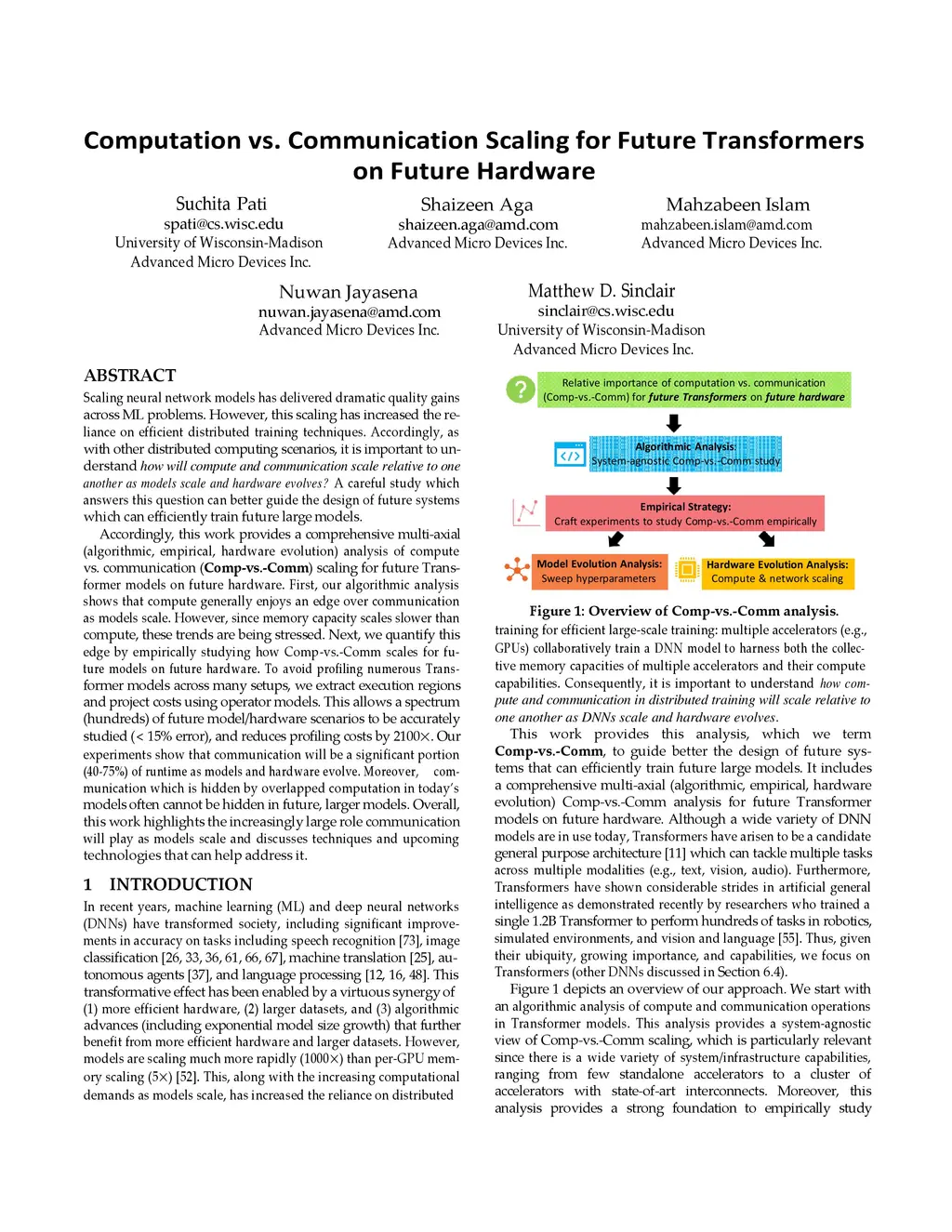 Scaling neural network models has delivered dramatic quality gains across ML problems. However, this scaling has increased the reliance on efficient distributed training techniques. Accordingly, as with other distributed computing scenarios, it is important to understand how will compute and communication scale relative to one another as models scale and hardware evolves? A careful study which answers this question can better guide the design of future systems which can efficiently train future large models. Accordingly, this work provides a comprehensive multi-axial (algorithmic, empirical, hardware evolution) analysis of compute vs. communication (Comp-vs.-Comm) scaling for future Transformer models on future hardware. First, our algorithmic analysis shows that compute generally enjoys an edge over communication as models scale. However, since memory capacity scales slower than compute, these trends are being stressed. Next, we quantify this edge by empirically studying how Comp-vs.-Comm scales for future models on future hardware. To avoid profiling numerous Transformer models across many setups, we extract execution regions and project costs using operator models. This allows a spectrum (hundreds) of future model/hardware scenarios to be accurately studied (15% error), and reduces profiling costs by 2100. Our experiments show that communication will be a significant portion (40-75%) of runtime as models and hardware evolve. Moreover, communication which is hidden by overlapped computation in today's models often cannot be hidden in future, larger models. Overall, this work highlights the increasingly large role communication will play as models scale and discusses techniques and upcoming technologies that can help address it.