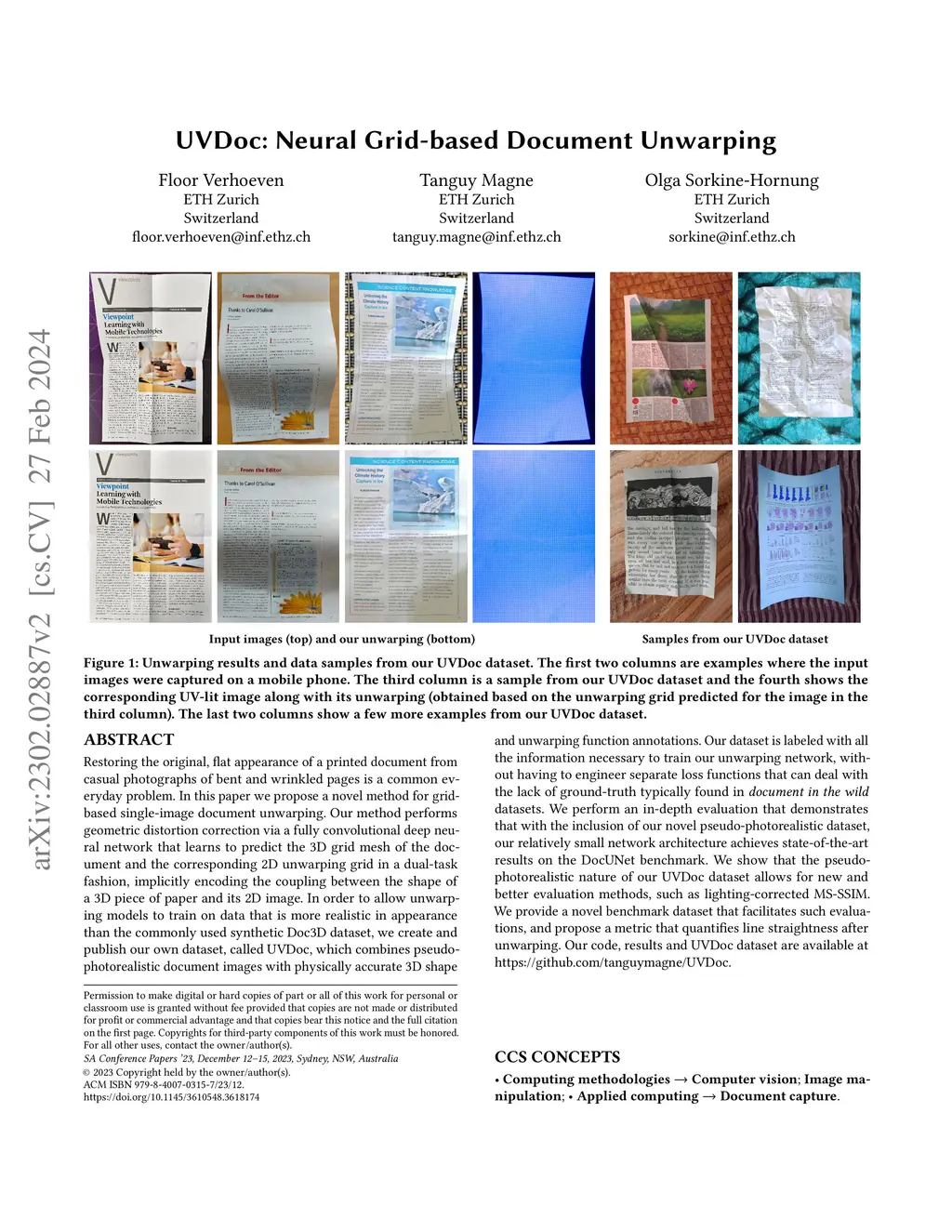 Restoring the original, flat appearance of a printed document from casual photographs of bent and wrinkled pages is a common everyday problem. In this paper we propose a novel method for grid-based single-image document unwarping. Our method performs geometric distortion correction via a fully convolutional deep neural network that learns to predict the 3D grid mesh of the document and the corresponding 2D unwarping grid in a dual-task fashion, implicitly encoding the coupling between the shape of a 3D piece of paper and its 2D image. In order to allow unwarping models to train on data that is more realistic in appearance than the commonly used synthetic Doc3D dataset, we create and publish our own dataset, called UVDoc, which combines pseudo-photorealistic document images with physically accurate 3D shape and unwarping function annotations. Our dataset is labeled with all the information necessary to train our unwarping network, without having to engineer separate loss functions that can deal with the lack of ground-truth typically found in document in the wild datasets. We perform an in-depth evaluation that demonstrates that with the inclusion of our novel pseudo-photorealistic dataset, our relatively small network architecture achieves state-of-the-art results on the DocUNet benchmark. We show that the pseudo-photorealistic nature of our UVDoc dataset allows for new and better evaluation methods, such as lighting-corrected MS-SSIM. We provide a novel benchmark dataset that facilitates such evaluations, and propose a metric that quantifies line straightness after unwarping. Our code, results and UVDoc dataset are available at https://github.com/tanguymagne/UVDoc.