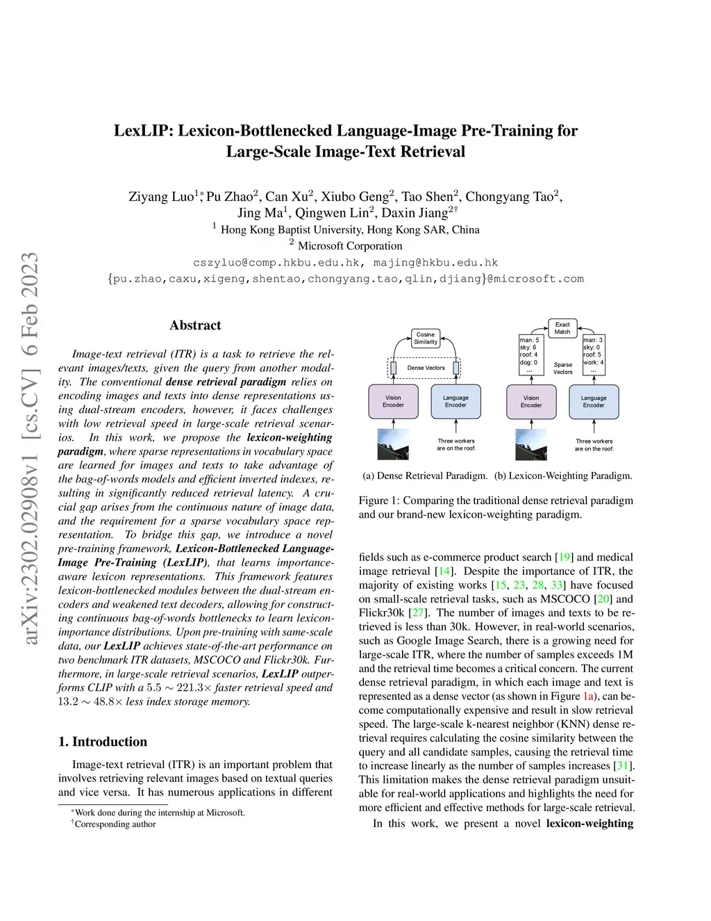Image-text retrieval (ITR) is a task to retrieve the relevant images/texts, given the query from another modality. The conventional dense retrieval paradigm relies on encoding images and texts into dense representations using dual-stream encoders, however, it faces challenges with low retrieval speed in large-scale retrieval scenarios. In this work, we propose the lexicon-weighting paradigm, where sparse representations in vocabulary space are learned for images and texts to take advantage of the bag-of-words models and efficient inverted indexes, resulting in significantly reduced retrieval latency. A crucial gap arises from the continuous nature of image data, and the requirement for a sparse vocabulary space representation. To bridge this gap, we introduce a novel pre-training framework, Lexicon-Bottlenecked Language-Image Pre-Training (LexLIP), that learns importance-aware lexicon representations. This framework features lexicon-bottlenecked modules between the dual-stream encoders and weakened text decoders, allowing for constructing continuous bag-of-words bottlenecks to learn lexicon-importance distributions. Upon pre-training with same-scale data, our LexLIP achieves state-of-the-art performance on two benchmark ITR datasets, MSCOCO and Flickr30k. Furthermore, in large-scale retrieval scenarios, LexLIP outperforms CLIP with a 5.5 ~ 221.3X faster retrieval speed and 13.2 ~ 48.8X less index storage memory.