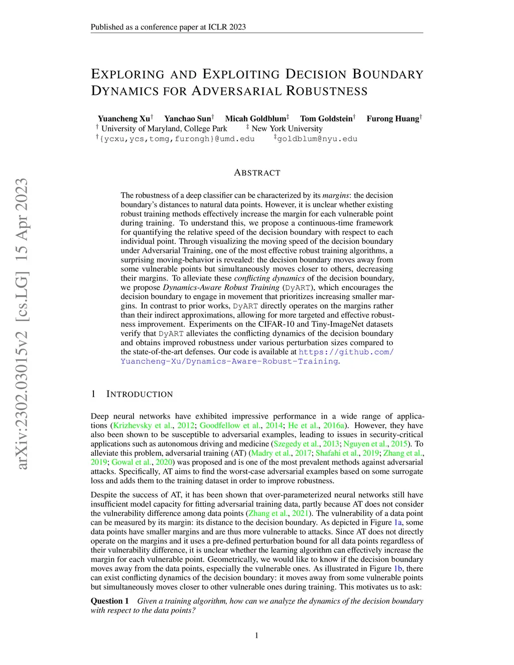 The robustness of a deep classifier can be characterized by its margins: the decision boundary's distances to natural data points. However, it is unclear whether existing robust training methods effectively increase the margin for each vulnerable point during training. To understand this, we propose a continuous-time framework for quantifying the relative speed of the decision boundary with respect to each individual point. Through visualizing the moving speed of the decision boundary under Adversarial Training, one of the most effective robust training algorithms, a surprising moving-behavior is revealed: the decision boundary moves away from some vulnerable points but simultaneously moves closer to others, decreasing their margins. To alleviate these conflicting dynamics of the decision boundary, we propose Dynamics-aware Robust Training (DyART), which encourages the decision boundary to engage in movement that prioritizes increasing smaller margins. In contrast to prior works, DyART directly operates on the margins rather than their indirect approximations, allowing for more targeted and effective robustness improvement. Experiments on the CIFAR-10 and Tiny-ImageNet datasets verify that DyART alleviates the conflicting dynamics of the decision boundary and obtains improved robustness under various perturbation sizes compared to the state-of-the-art defenses. Our code is available at https://github.com/Yuancheng-Xu/Dynamics-Aware-Robust-Training.