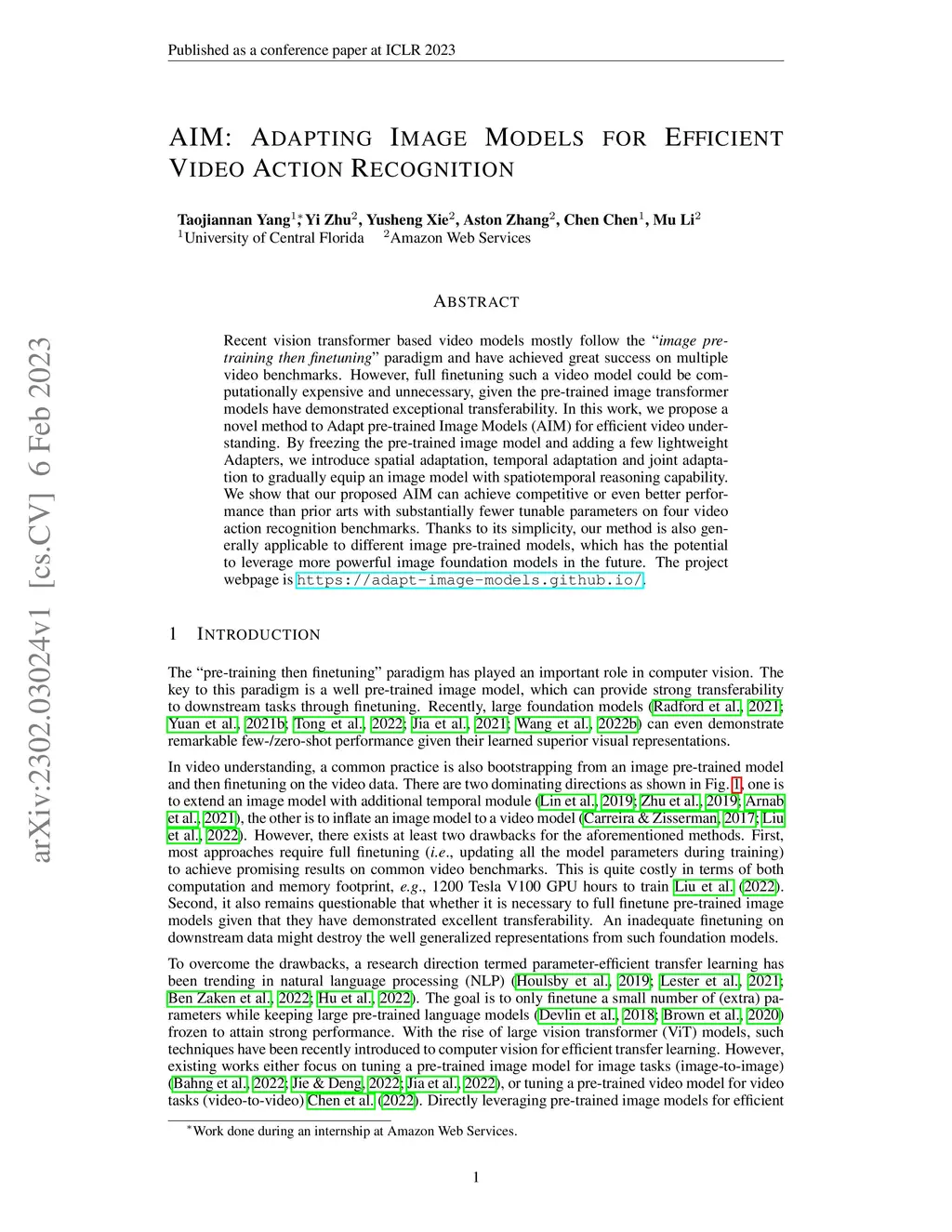 Recent vision transformer based video models mostly follow the ``image pre-training then finetuning" paradigm and have achieved great success on multiple video benchmarks. However, full finetuning such a video model could be computationally expensive and unnecessary, given the pre-trained image transformer models have demonstrated exceptional transferability. In this work, we propose a novel method to Adapt pre-trained Image Models (AIM) for efficient video understanding. By freezing the pre-trained image model and adding a few lightweight Adapters, we introduce spatial adaptation, temporal adaptation and joint adaptation to gradually equip an image model with spatiotemporal reasoning capability. We show that our proposed AIM can achieve competitive or even better performance than prior arts with substantially fewer tunable parameters on four video action recognition benchmarks. Thanks to its simplicity, our method is also generally applicable to different image pre-trained models, which has the potential to leverage more powerful image foundation models in the future. The project webpage is \url{https://adapt-image-models.github.io/}.