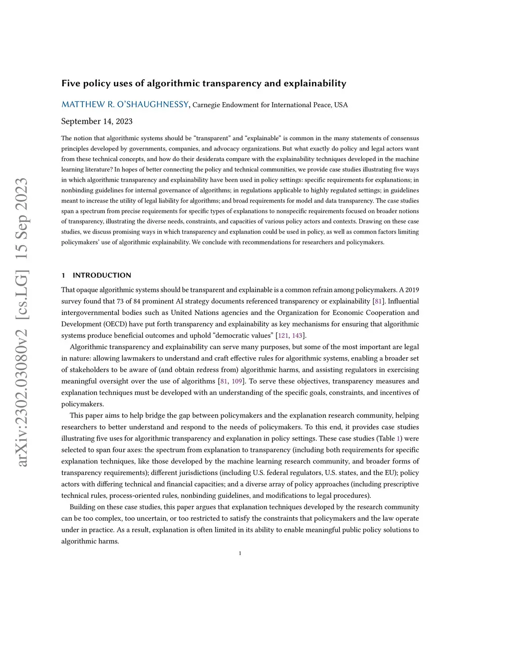 The notion that algorithmic systems should be "transparent" and "explainable" is common in the many statements of consensus principles developed by governments, companies, and advocacy organizations. But what exactly do policy and legal actors want from these technical concepts, and how do their desiderata compare with the explainability techniques developed in the machine learning literature? In hopes of better connecting the policy and technical communities, we provide case studies illustrating five ways in which algorithmic transparency and explainability have been used in policy settings: specific requirements for explanations; in nonbinding guidelines for internal governance of algorithms; in regulations applicable to highly regulated settings; in guidelines meant to increase the utility of legal liability for algorithms; and broad requirements for model and data transparency. The case studies span a spectrum from precise requirements for specific types of explanations to nonspecific requirements focused on broader notions of transparency, illustrating the diverse needs, constraints, and capacities of various policy actors and contexts. Drawing on these case studies, we discuss promising ways in which transparency and explanation could be used in policy, as well as common factors limiting policymakers' use of algorithmic explainability. We conclude with recommendations for researchers and policymakers.