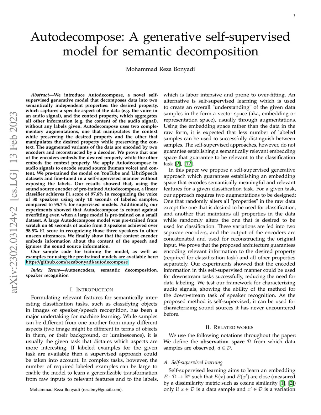 We introduce Autodecompose, a novel self-supervised generative model that decomposes data into two semantically independent properties: the desired property, which captures a specific aspect of the data (e.g. the voice in an audio signal), and the context property, which aggregates all other information (e.g. the content of the audio signal), without any labels given. Autodecompose uses two complementary augmentations, one that manipulates the context while preserving the desired property and the other that manipulates the desired property while preserving the context. The augmented variants of the data are encoded by two encoders and reconstructed by a decoder. We prove that one of the encoders embeds the desired property while the other embeds the context property. We apply Autodecompose to audio signals to encode sound source (human voice) and content. We pre-trained the model on YouTube and LibriSpeech datasets and fine-tuned in a self-supervised manner without exposing the labels. Our results showed that, using the sound source encoder of pre-trained Autodecompose, a linear classifier achieves F1 score of 97.6\% in recognizing the voice of 30 speakers using only 10 seconds of labeled samples, compared to 95.7\% for supervised models. Additionally, our experiments showed that Autodecompose is robust against overfitting even when a large model is pre-trained on a small dataset. A large Autodecompose model was pre-trained from scratch on 60 seconds of audio from 3 speakers achieved over 98.5\% F1 score in recognizing those three speakers in other unseen utterances. We finally show that the context encoder embeds information about the content of the speech and ignores the sound source information. Our sample code for training the model, as well as examples for using the pre-trained models are available here: \url{https://github.com/rezabonyadi/autodecompose}