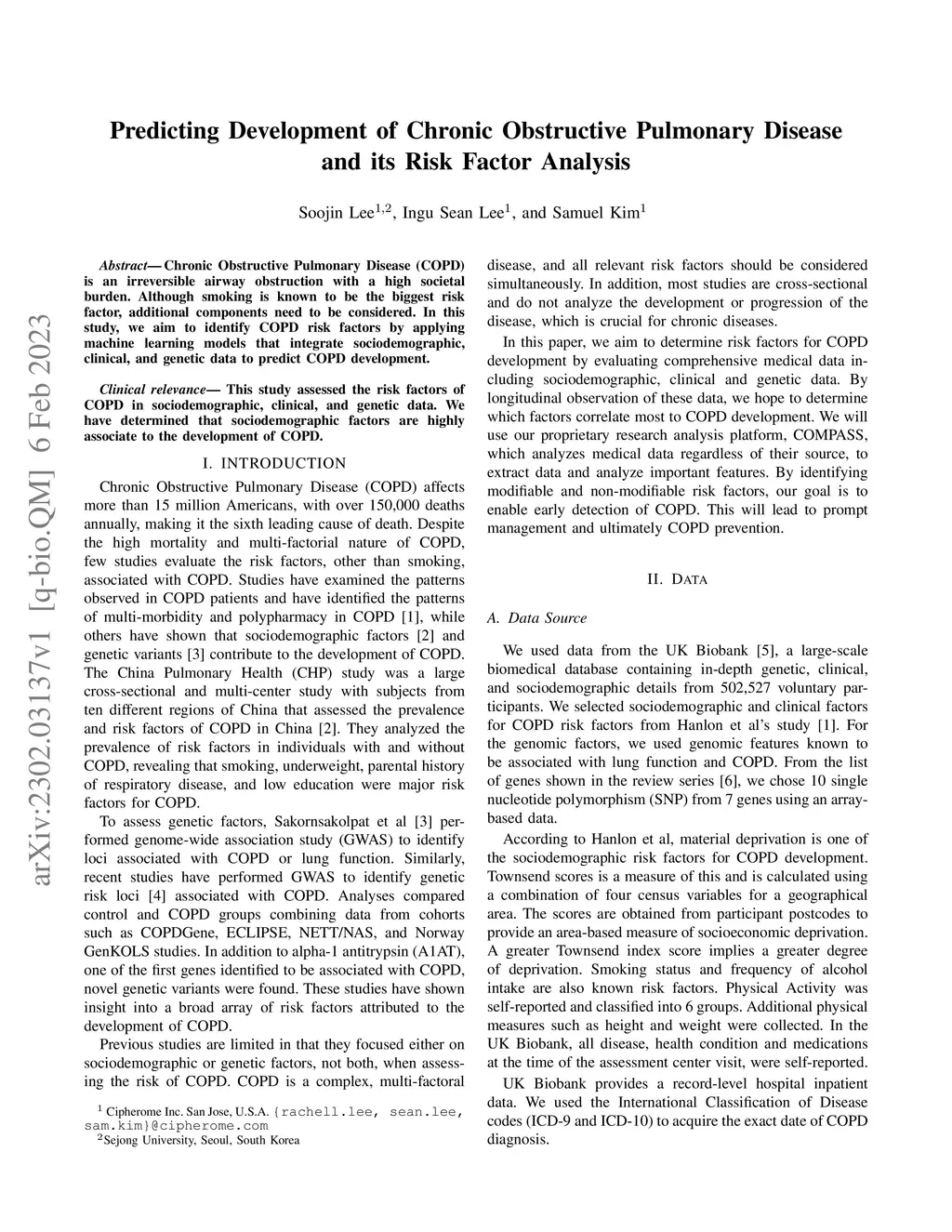 Chronic Obstructive Pulmonary Disease (COPD) is an irreversible airway obstruction with a high societal burden. Although smoking is known to be the biggest risk factor, additional components need to be considered. In this study, we aim to identify COPD risk factors by applying machine learning models that integrate sociodemographic, clinical, and genetic data to predict COPD development.