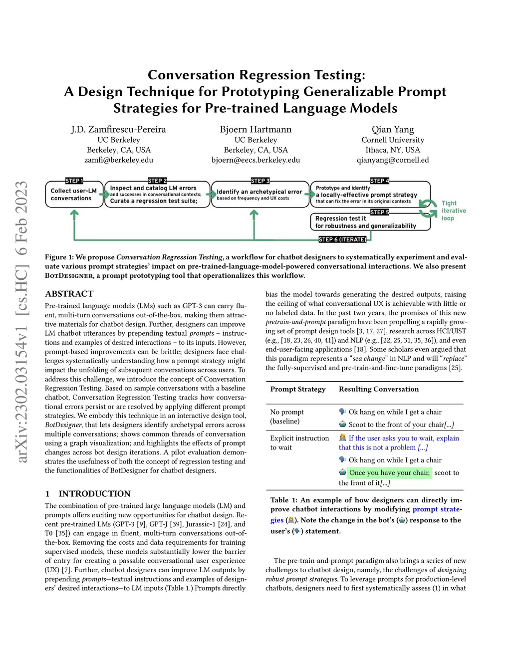 Pre-trained language models (LLMs) such as GPT-3 can carry fluent, multi-turn conversations out-of-the-box, making them attractive materials for chatbot design. Further, designers can improve LLM chatbot utterances by prepending textual prompts -- instructions and examples of desired interactions -- to its inputs. However, prompt-based improvements can be brittle; designers face challenges systematically understanding how a prompt strategy might impact the unfolding of subsequent conversations across users. To address this challenge, we introduce the concept of Conversation Regression Testing. Based on sample conversations with a baseline chatbot, Conversation Regression Testing tracks how conversational errors persist or are resolved by applying different prompt strategies. We embody this technique in an interactive design tool, BotDesigner, that lets designers identify archetypal errors across multiple conversations; shows common threads of conversation using a graph visualization; and highlights the effects of prompt changes across bot design iterations. A pilot evaluation demonstrates the usefulness of both the concept of regression testing and the functionalities of BotDesigner for chatbot designers.