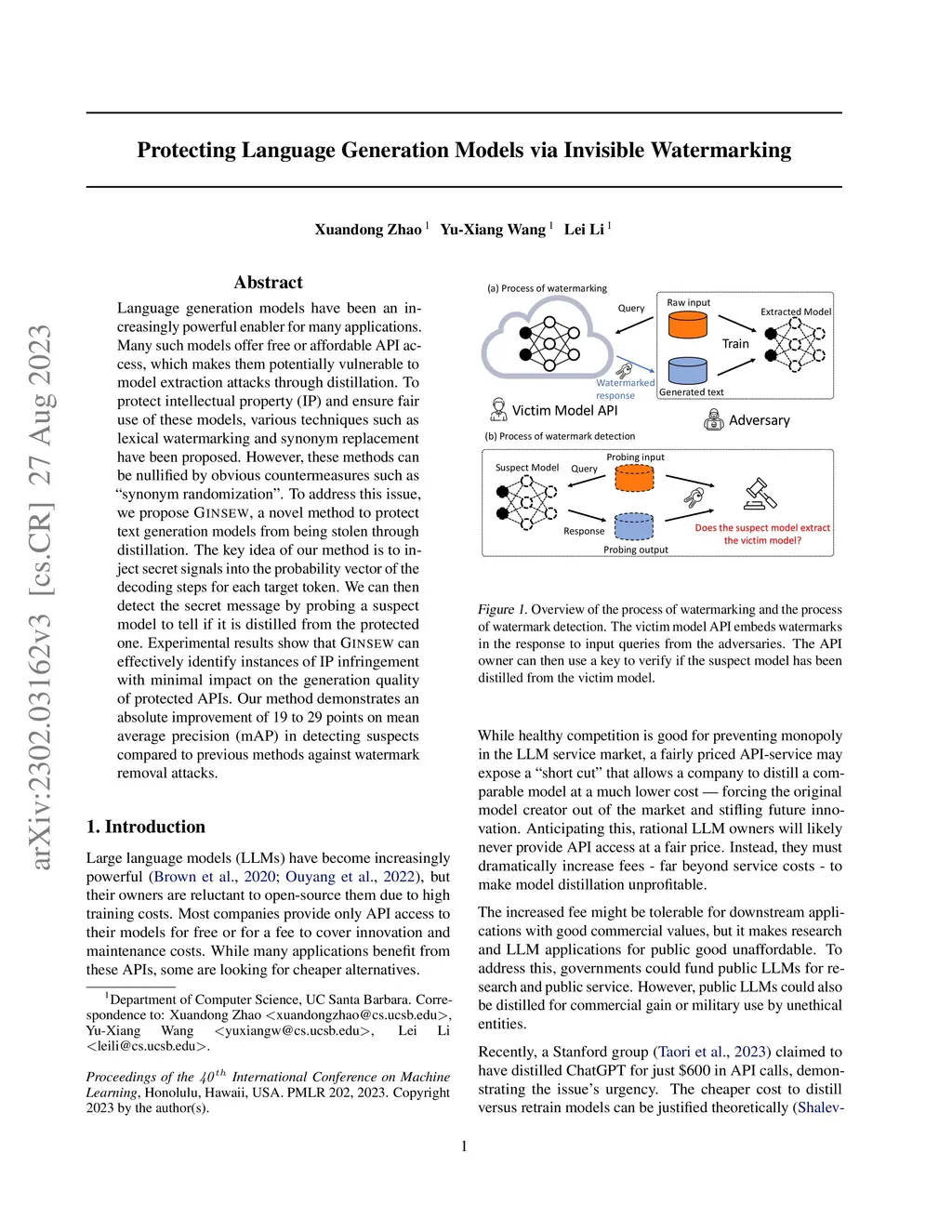 Language generation models have been an increasingly powerful enabler for many applications. Many such models offer free or affordable API access, which makes them potentially vulnerable to model extraction attacks through distillation. To protect intellectual property (IP) and ensure fair use of these models, various techniques such as lexical watermarking and synonym replacement have been proposed. However, these methods can be nullified by obvious countermeasures such as "synonym randomization". To address this issue, we propose GINSEW, a novel method to protect text generation models from being stolen through distillation. The key idea of our method is to inject secret signals into the probability vector of the decoding steps for each target token. We can then detect the secret message by probing a suspect model to tell if it is distilled from the protected one. Experimental results show that GINSEW can effectively identify instances of IP infringement with minimal impact on the generation quality of protected APIs. Our method demonstrates an absolute improvement of 19 to 29 points on mean average precision (mAP) in detecting suspects compared to previous methods against watermark removal attacks.