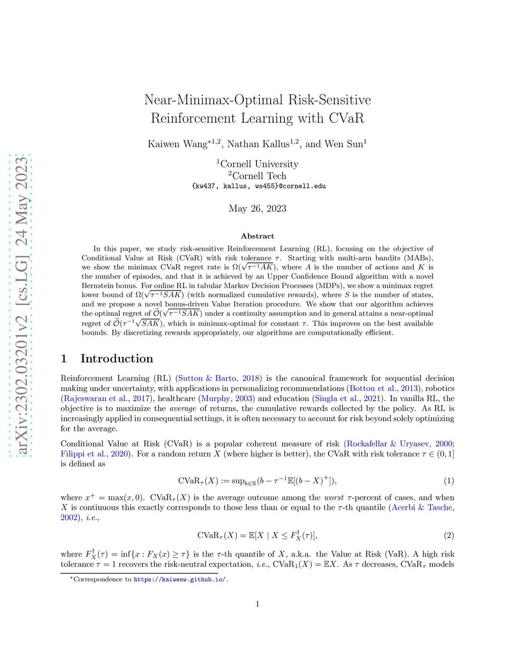In this paper, we study risk-sensitive Reinforcement Learning (RL), focusing on the objective of Conditional Value at Risk (CVaR) with risk tolerance . Starting with multi-arm bandits (MABs), we show the minimax CVaR regret rate is , where is the number of actions and is the number of episodes, and that it is achieved by an Upper Confidence Bound algorithm with a novel Bernstein bonus. For online RL in tabular Markov Decision Processes (MDPs), we show a minimax regret lower bound of (with normalized cumulative rewards), where is the number of states, and we propose a novel bonus-driven Value Iteration procedure. We show that our algorithm achieves the optimal regret of under a continuity assumption and in general attains a near-optimal regret of , which is minimax-optimal for constant . This improves on the best available bounds. By discretizing rewards appropriately, our algorithms are computationally efficient.