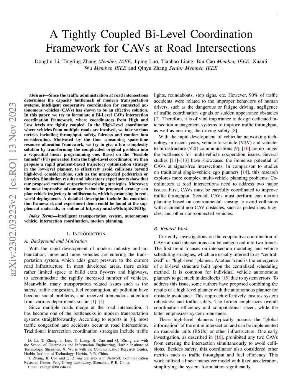 Since the traffic administration at road intersections determines the capacity bottleneck of modern transportation systems, intelligent cooperative coordination for connected autonomous vehicles (CAVs) has shown to be an effective solution. In this paper, we try to formulate a Bi-Level CAV intersection coordination framework, where coordinators from High and Low levels are tightly coupled. In the High-Level coordinator where vehicles from multiple roads are involved, we take various metrics including throughput, safety, fairness and comfort into consideration. Motivated by the time consuming space-time resource allocation framework in [1], we try to give a low complexity solution by transforming the complicated original problem into a sequential linear programming one. Based on the "feasible tunnels" (FT) generated from the High-Level coordinator, we then propose a rapid gradient-based trajectory optimization strategy in the Low-Level planner, to effectively avoid collisions beyond High-level considerations, such as the pedestrian or bicycles. Simulation results and laboratory experiments show that our proposed method outperforms existing strategies. Moreover, the most impressive advantage is that the proposed strategy can plan vehicle trajectory in milliseconds, which is promising in realworld deployments. A detailed description include the coordination framework and experiment demo could be found at the supplement materials, or online at https://youtu.be/MuhjhKfNIOg.