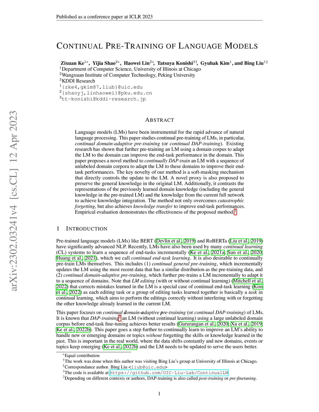 Language models (LMs) have been instrumental for the rapid advance of natural language processing. This paper studies continual pre-training of LMs, in particular, continual domain-adaptive pre-training (or continual DAP-training). Existing research has shown that further pre-training an LM using a domain corpus to adapt the LM to the domain can improve the end-task performance in the domain. This paper proposes a novel method to continually DAP-train an LM with a sequence of unlabeled domain corpora to adapt the LM to these domains to improve their end-task performances. The key novelty of our method is a soft-masking mechanism that directly controls the update to the LM. A novel proxy is also proposed to preserve the general knowledge in the original LM. Additionally, it contrasts the representations of the previously learned domain knowledge (including the general knowledge in the pre-trained LM) and the knowledge from the current full network to achieve knowledge integration. The method not only overcomes catastrophic forgetting, but also achieves knowledge transfer to improve end-task performances. Empirical evaluation demonstrates the effectiveness of the proposed method.