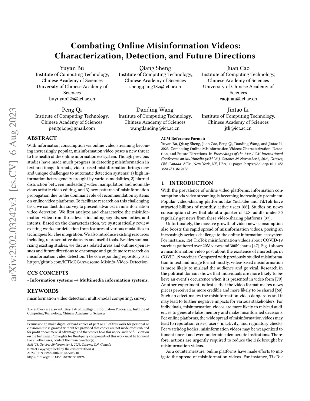 With information consumption via online video streaming becoming increasingly popular, misinformation video poses a new threat to the health of the online information ecosystem. Though previous studies have made much progress in detecting misinformation in text and image formats, video-based misinformation brings new and unique challenges to automatic detection systems: 1) high information heterogeneity brought by various modalities, 2) blurred distinction between misleading video manipulation and nonmalicious artistic video editing, and 3) new patterns of misinformation propagation due to the dominant role of recommendation systems on online video platforms. To facilitate research on this challenging task, we conduct this survey to present advances in misinformation video detection. We first analyze and characterize the misinformation video from three levels including signals, semantics, and intents. Based on the characterization, we systematically review existing works for detection from features of various modalities to techniques for clue integration. We also introduce existing resources including representative datasets and useful tools. Besides summarizing existing studies, we discuss related areas and outline open issues and future directions to encourage and guide more research on misinformation video detection. The corresponding repository is at https://github.com/ICTMCG/Awesome-Misinfo-Video-Detection.