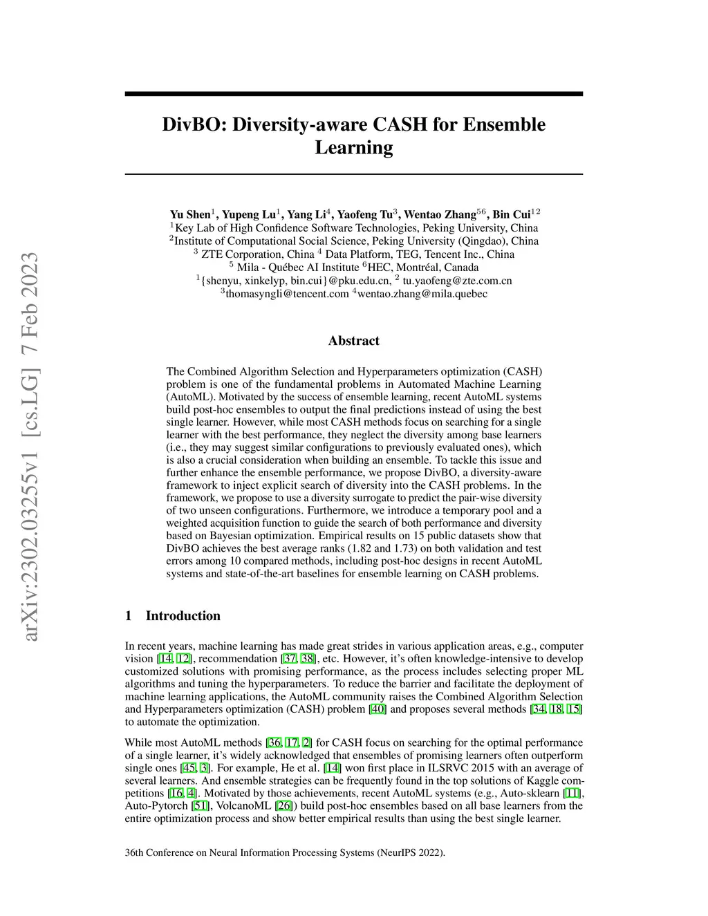 DivBO: Diversity-aware CASH for Ensemble Learning