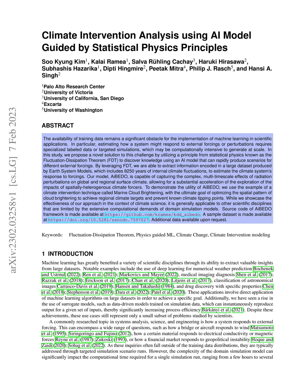 The availability of training data remains a significant obstacle for the implementation of machine learning in scientific applications. In particular, estimating how a system might respond to external forcings or perturbations requires specialized labeled data or targeted simulations, which may be computationally intensive to generate at scale. In this study, we propose a novel solution to this challenge by utilizing a principle from statistical physics known as the Fluctuation-Dissipation Theorem (FDT) to discover knowledge using an AI model that can rapidly produce scenarios for different external forcings. By leveraging FDT, we are able to extract information encoded in a large dataset produced by Earth System Models, which includes 8250 years of internal climate fluctuations, to estimate the climate system's response to forcings. Our model, AiBEDO, is capable of capturing the complex, multi-timescale effects of radiation perturbations on global and regional surface climate, allowing for a substantial acceleration of the exploration of the impacts of spatially-heterogenous climate forcers. To demonstrate the utility of AiBEDO, we use the example of a climate intervention technique called Marine Cloud Brightening, with the ultimate goal of optimizing the spatial pattern of cloud brightening to achieve regional climate targets and prevent known climate tipping points. While we showcase the effectiveness of our approach in the context of climate science, it is generally applicable to other scientific disciplines that are limited by the extensive computational demands of domain simulation models. Source code of AiBEDO framework is made available at https://github.com/kramea/kdd_aibedo. A sample dataset is made available at https://doi.org/10.5281/zenodo.7597027. Additional data available upon request.