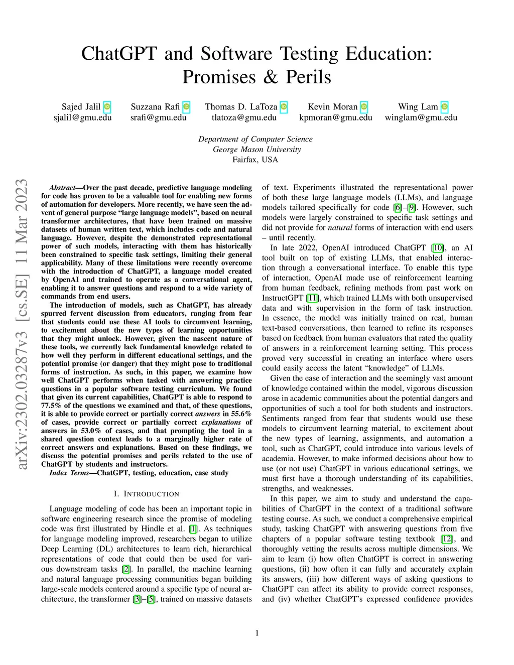 Over the past decade, predictive language modeling for code has proven to be a valuable tool for enabling new forms of automation for developers. More recently, we have seen the advent of general purpose "large language models", based on neural transformer architectures, that have been trained on massive datasets of human written text spanning code and natural language. However, despite the demonstrated representational power of such models, interacting with them has historically been constrained to specific task settings, limiting their general applicability. Many of these limitations were recently overcome with the introduction of ChatGPT, a language model created by OpenAI and trained to operate as a conversational agent, enabling it to answer questions and respond to a wide variety of commands from end users. The introduction of models, such as ChatGPT, has already spurred fervent discussion from educators, ranging from fear that students could use these AI tools to circumvent learning, to excitement about the new types of learning opportunities that they might unlock. However, given the nascent nature of these tools, we currently lack fundamental knowledge related to how well they perform in different educational settings, and the potential promise (or danger) that they might pose to traditional forms of instruction. As such, in this paper, we examine how well ChatGPT performs when tasked with answering common questions in a popular software testing curriculum. Our findings indicate that ChatGPT can provide correct or partially correct answers in 55.6% of cases, provide correct or partially correct explanations of answers in 53.0% of cases, and that prompting the tool in a shared question context leads to a marginally higher rate of correct responses. Based on these findings, we discuss the potential promises and perils related to the use of ChatGPT by students and instructors.