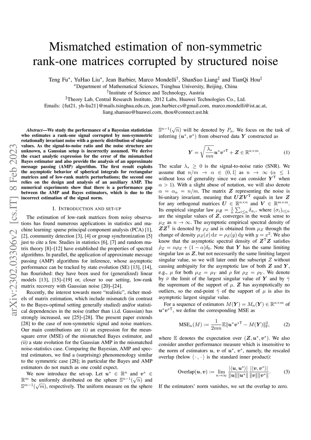 We study the performance of a Bayesian statistician who estimates a rank-one signal corrupted by non-symmetric rotationally invariant noise with a generic distribution of singular values. As the signal-to-noise ratio and the noise structure are unknown, a Gaussian setup is incorrectly assumed. We derive the exact analytic expression for the error of the mismatched Bayes estimator and also provide the analysis of an approximate message passing (AMP) algorithm. The first result exploits the asymptotic behavior of spherical integrals for rectangular matrices and of low-rank matrix perturbations; the second one relies on the design and analysis of an auxiliary AMP. The numerical experiments show that there is a performance gap between the AMP and Bayes estimators, which is due to the incorrect estimation of the signal norm.