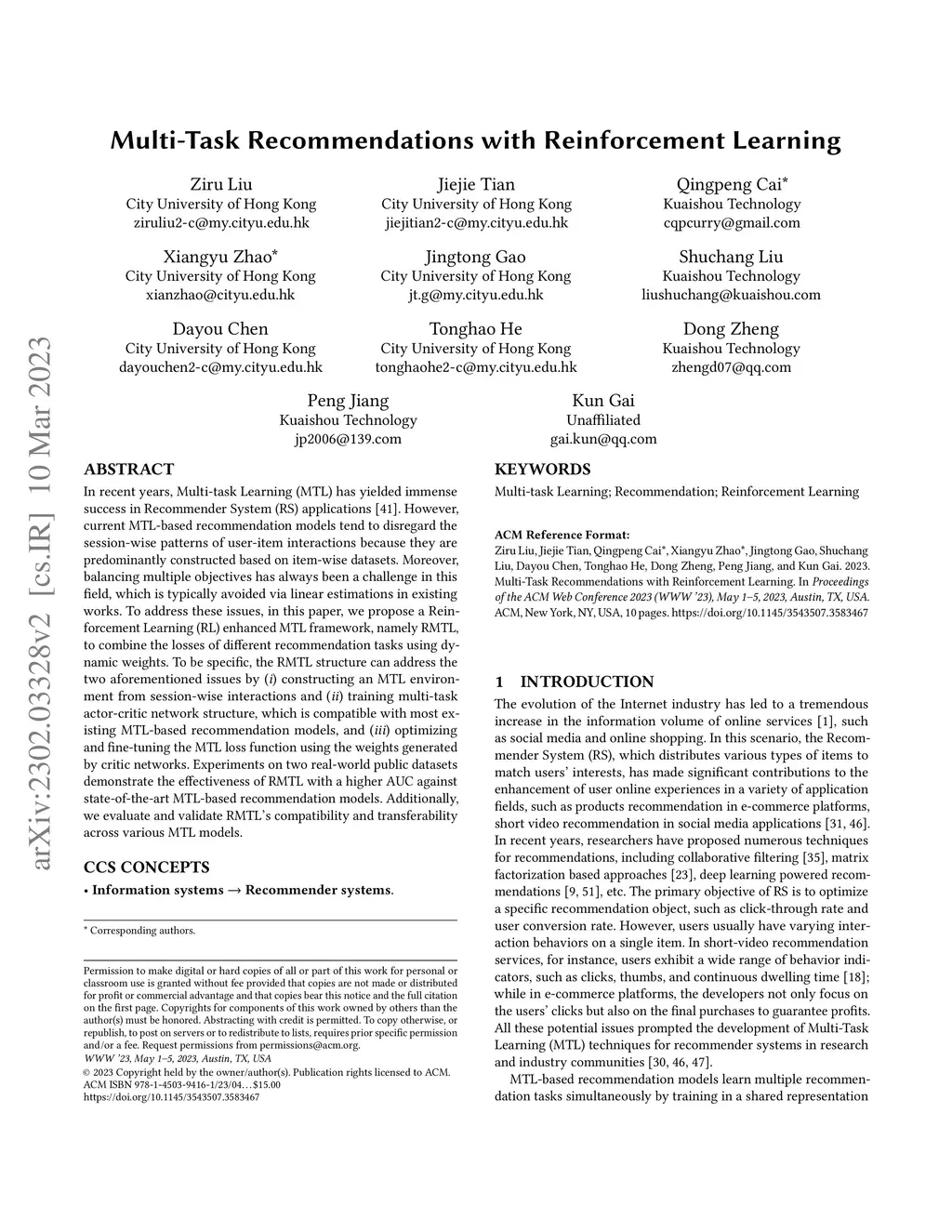 In recent years, Multi-task Learning (MTL) has yielded immense success in Recommender System (RS) applications. However, current MTL-based recommendation models tend to disregard the session-wise patterns of user-item interactions because they are predominantly constructed based on item-wise datasets. Moreover, balancing multiple objectives has always been a challenge in this field, which is typically avoided via linear estimations in existing works. To address these issues, in this paper, we propose a Reinforcement Learning (RL) enhanced MTL framework, namely RMTL, to combine the losses of different recommendation tasks using dynamic weights. To be specific, the RMTL structure can address the two aforementioned issues by (i) constructing an MTL environment from session-wise interactions and (ii) training multi-task actor-critic network structure, which is compatible with most existing MTL-based recommendation models, and (iii) optimizing and fine-tuning the MTL loss function using the weights generated by critic networks. Experiments on two real-world public datasets demonstrate the effectiveness of RMTL with a higher AUC against state-of-the-art MTL-based recommendation models. Additionally, we evaluate and validate RMTL's compatibility and transferability across various MTL models.