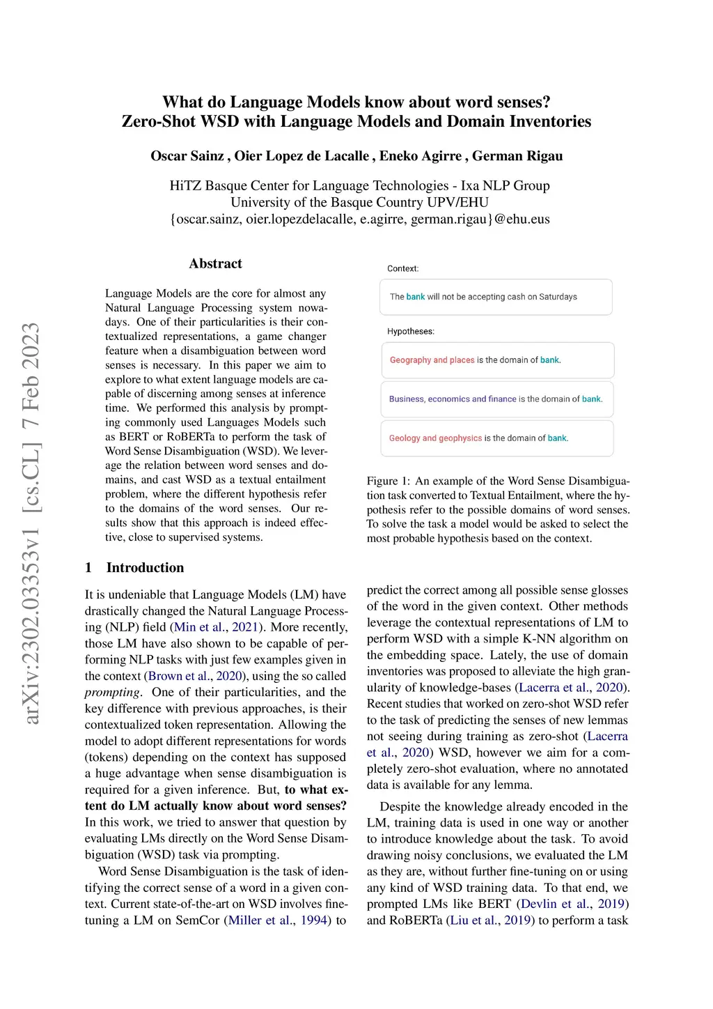 Language Models are the core for almost any Natural Language Processing system nowadays. One of their particularities is their contextualized representations, a game changer feature when a disambiguation between word senses is necessary. In this paper we aim to explore to what extent language models are capable of discerning among senses at inference time. We performed this analysis by prompting commonly used Languages Models such as BERT or RoBERTa to perform the task of Word Sense Disambiguation (WSD). We leverage the relation between word senses and domains, and cast WSD as a textual entailment problem, where the different hypothesis refer to the domains of the word senses. Our results show that this approach is indeed effective, close to supervised systems.