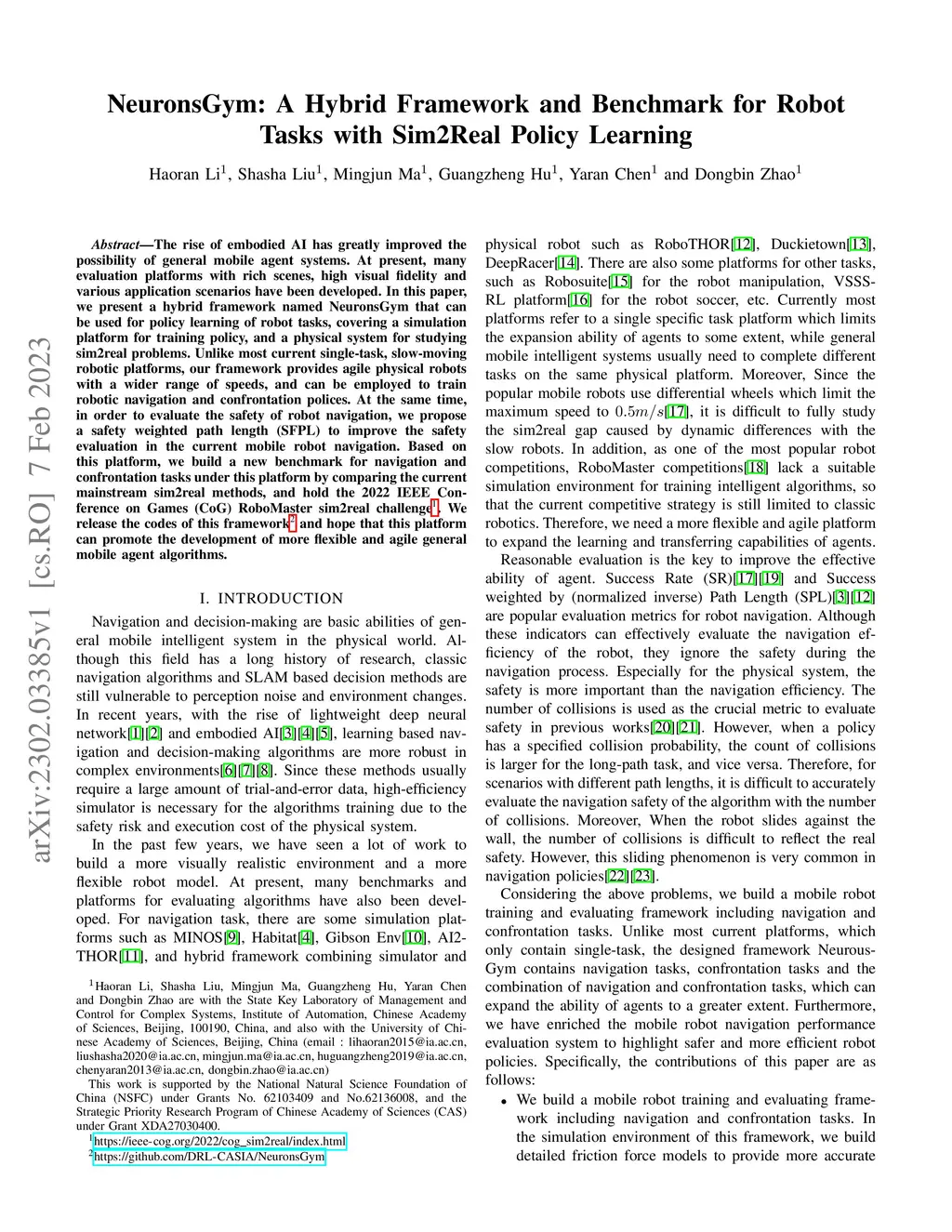 The rise of embodied AI has greatly improved the possibility of general mobile agent systems. At present, many evaluation platforms with rich scenes, high visual fidelity and various application scenarios have been developed. In this paper, we present a hybrid framework named NeuronsGym that can be used for policy learning of robot tasks, covering a simulation platform for training policy, and a physical system for studying sim2real problems. Unlike most current single-task, slow-moving robotic platforms, our framework provides agile physical robots with a wider range of speeds, and can be employed to train robotic navigation and confrontation policies. At the same time, in order to evaluate the safety of robot navigation, we propose a safety-weighted path length (SFPL) to improve the safety evaluation in the current mobile robot navigation. Based on this platform, we build a new benchmark for navigation and confrontation tasks under this platform by comparing the current mainstream sim2real methods, and hold the 2022 IEEE Conference on Games (CoG) RoboMaster sim2real challenge. We release the codes of this framework\footnote{\url{https://github.com/DRL-CASIA/NeuronsGym}} and hope that this platform can promote the development of more flexible and agile general mobile agent algorithms.