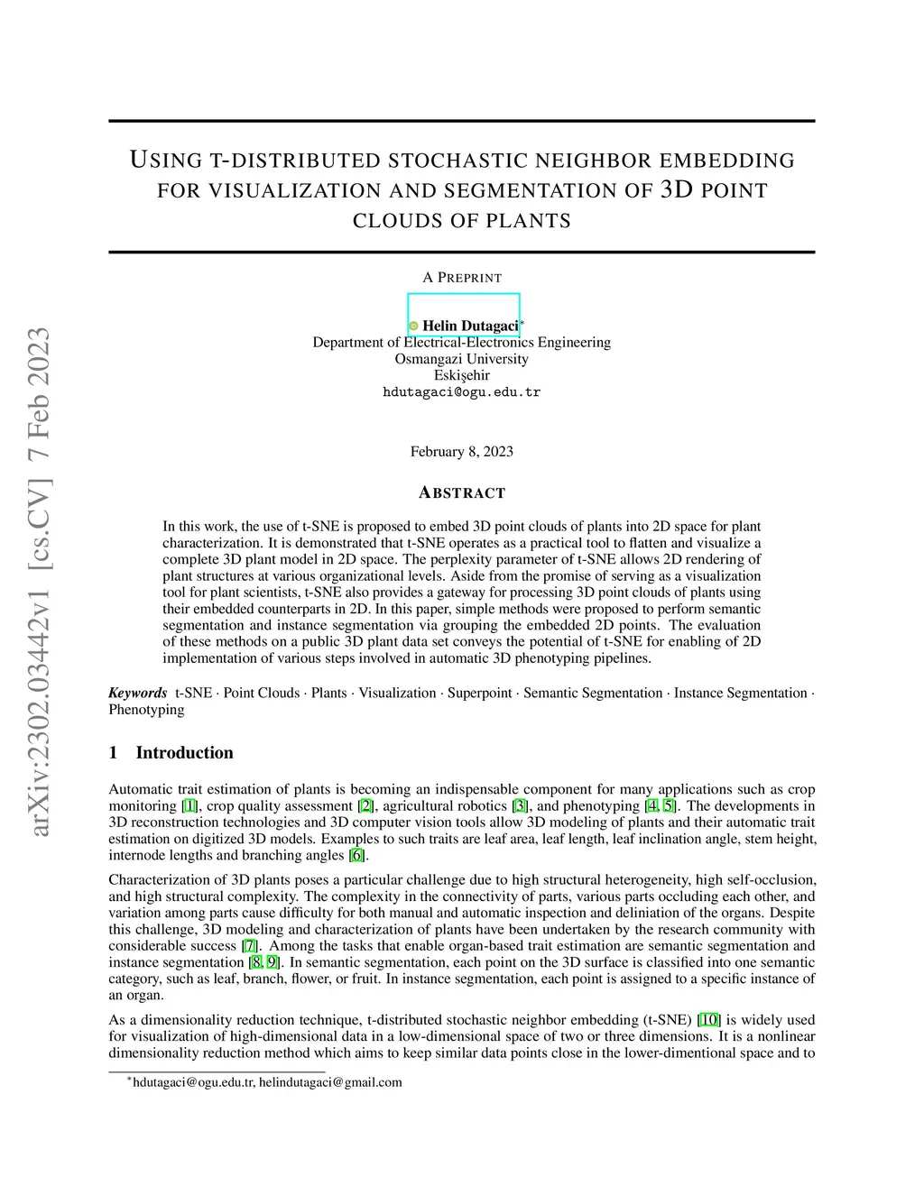 In this work, the use of t-SNE is proposed to embed 3D point clouds of plants into 2D space for plant characterization. It is demonstrated that t-SNE operates as a practical tool to flatten and visualize a complete 3D plant model in 2D space. The perplexity parameter of t-SNE allows 2D rendering of plant structures at various organizational levels. Aside from the promise of serving as a visualization tool for plant scientists, t-SNE also provides a gateway for processing 3D point clouds of plants using their embedded counterparts in 2D. In this paper, simple methods were proposed to perform semantic segmentation and instance segmentation via grouping the embedded 2D points. The evaluation of these methods on a public 3D plant data set conveys the potential of t-SNE for enabling of 2D implementation of various steps involved in automatic 3D phenotyping pipelines.
